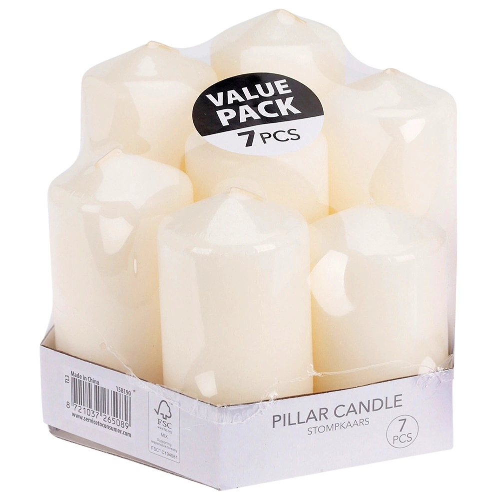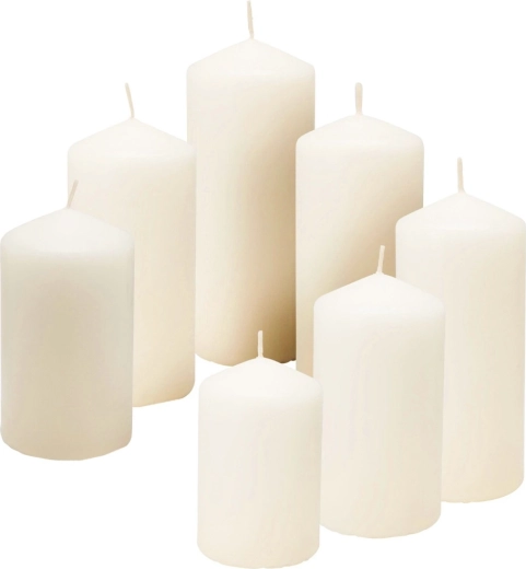 Elegantní sada sedmi bílých válcových svíček bez vůně v různých výškách pro univerzální dekorace domova. Rovnoměrné hoření, dlouhá doba hoření 32–60 h a nadčasový odstín slonové kosti z nich dělají ideální volbu do svícnů, luceren i na sváteční aranžmá.