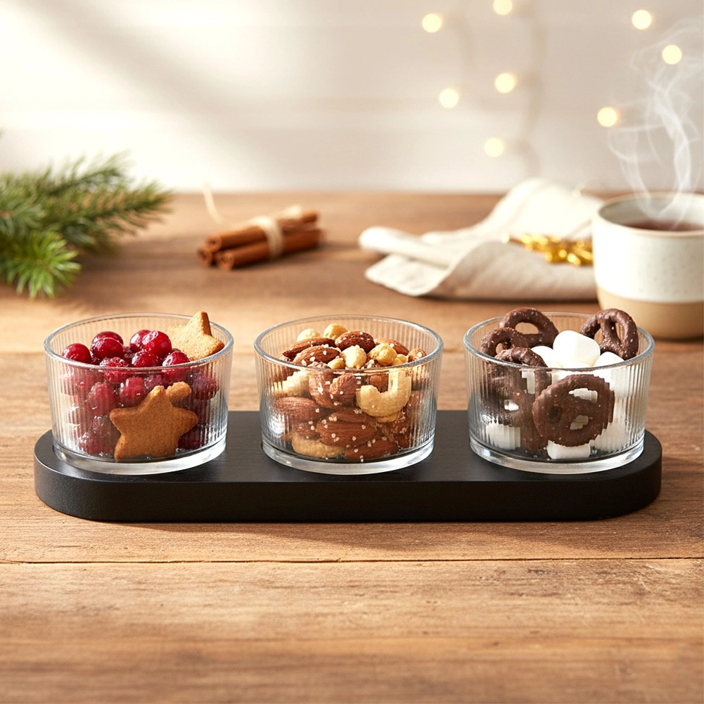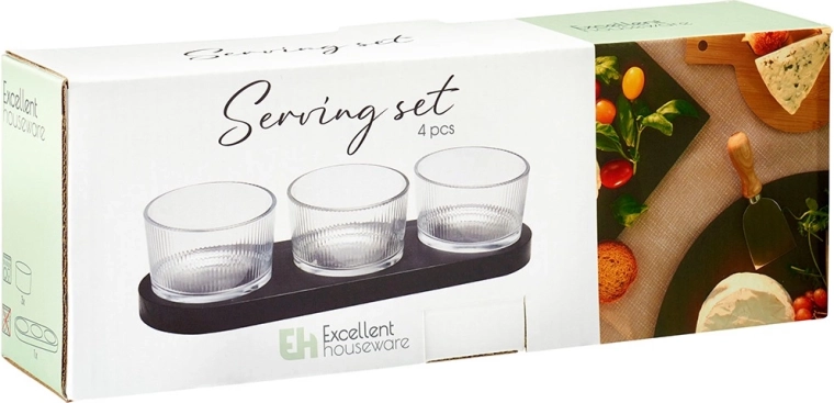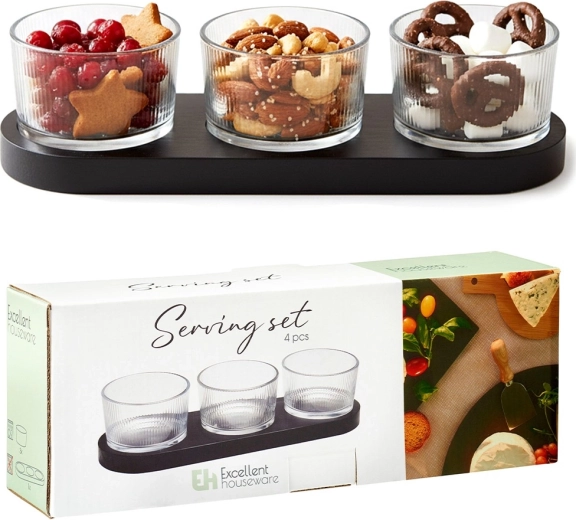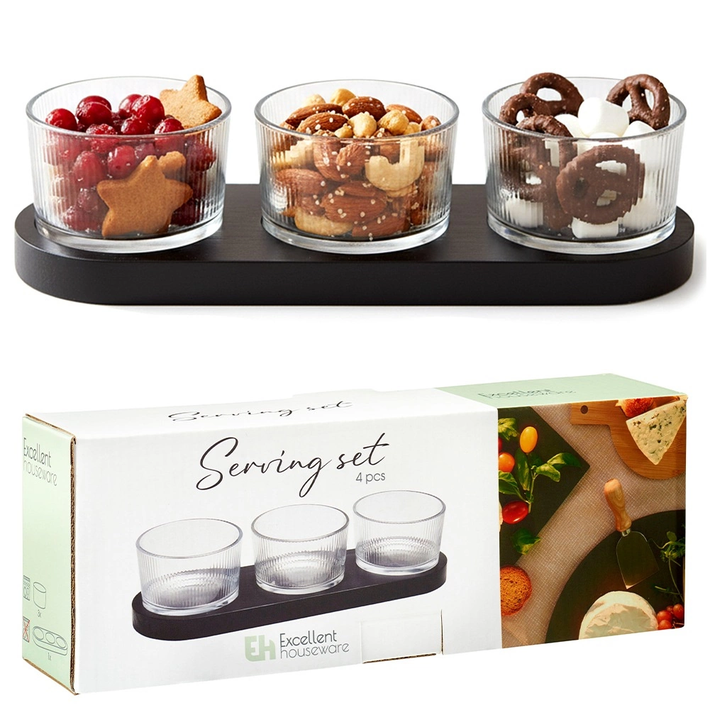 Elegantní 4dílná sada pro servírování občerstvení kombinuje tři skleněné mističky a obdélníkový dřevěný tác v černé barvě. Ideální na dipové omáčky, olivy, oříšky a antipasti. Moderní design s ryhovaným sklem a praktické výsady pro stabilitu misek zaručují pohodlné a stylové podávání.