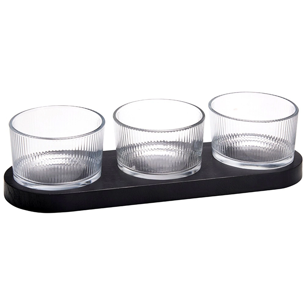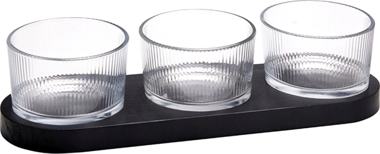 Tato stylová sada na servírování je perfektní volbou pro každodenní použití i slavnostní příležitosti. Kombinace transparentního, dekorativně ryhovaného skla a černého dřevěného tácu dodá vašemu stolu moderní a elegantní vzhled. Praktická velikost misek i tácu umožňuje snadno servírovat různé druhy drobných pochoutek.