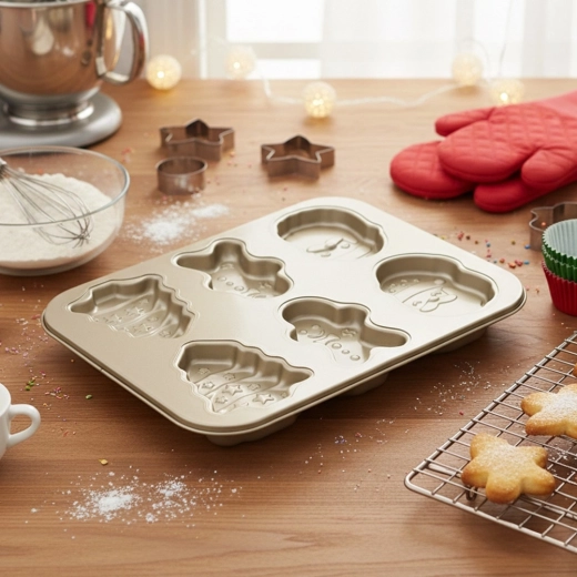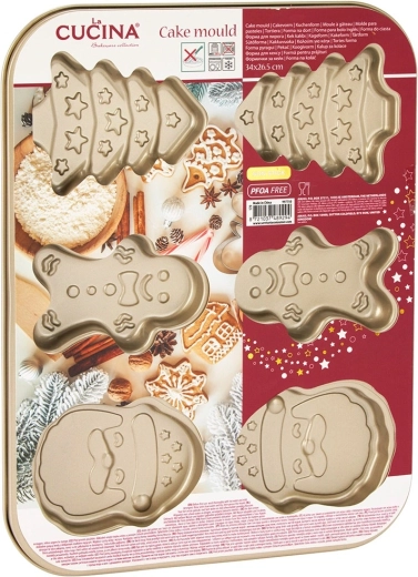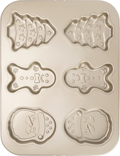 Tato stylová forma v odstínu šampaňského zlata nabízí 6 důlků se třemi oblíbenými vánočními motivy. Skvěle se hodí na perníčky, křehké sušenky, ale i mini cheesecaky či cupcaky. Ocelové tělo se postará o stabilitu a rovnoměrné propečení, nepřilnavý povrch PTFE zase o snadné vyjmutí bez potrhaných okrajů.