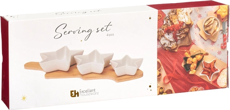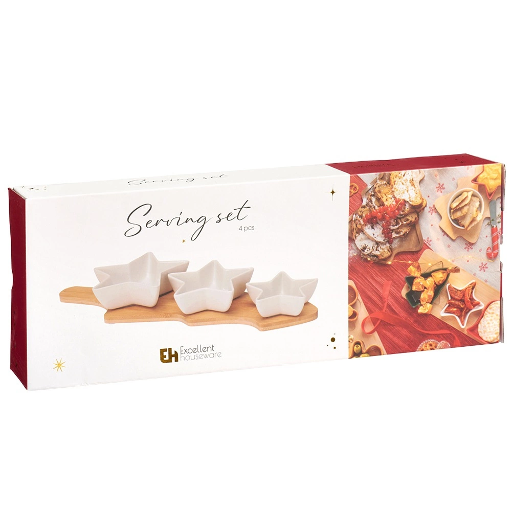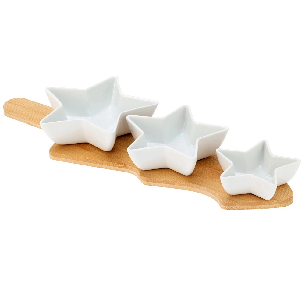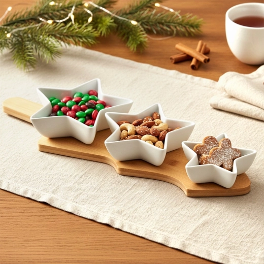 Stylová 4dílná sada na servírování s porcelánovými mističkami ve tvaru hvězdy a bambusovým tácem ve tvaru stromečku. Ideální pro elegantní podávání oříšků, oliv, dipů a drobných pochoutek. Kvalitní porcelán v bílé barvě a přírodní bambus tvoří harmonickou kombinaci, která ozdobí každý sváteční stůl.