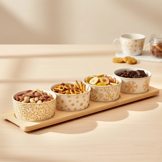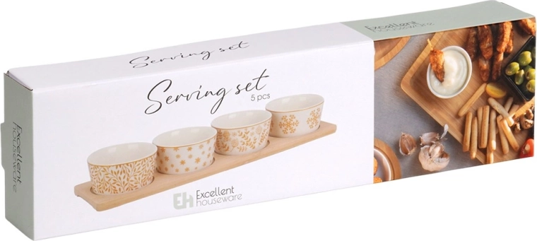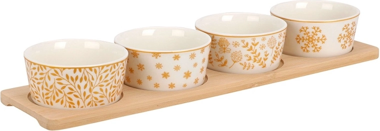 Elegantní 5dílná sada pro servírování obsahuje bambusový podnos a čtyři porcelánové mističky s různími zimními motivy. Ideální na oříšky, olivy, dipy a další drobné pochoutky. Stabilní podnos s vybráními brání posunu mističek, porcelán je vhodný do myčky. Kompaktní rozměry usnadní stylové servírování při svátečních setkáních.