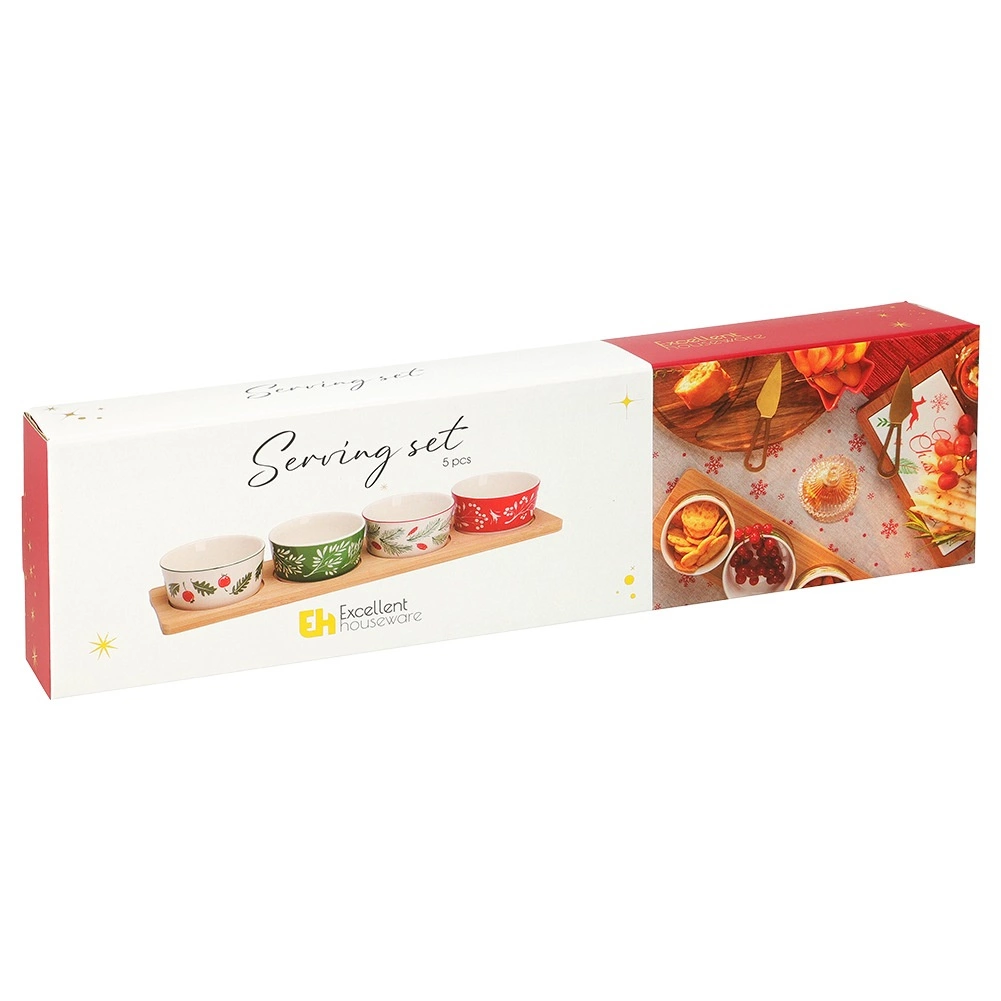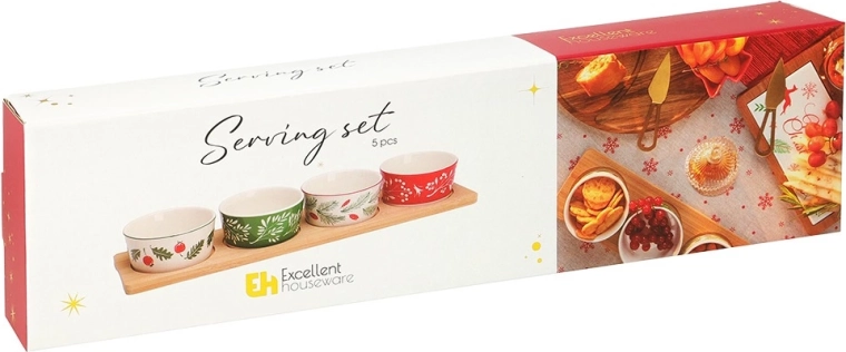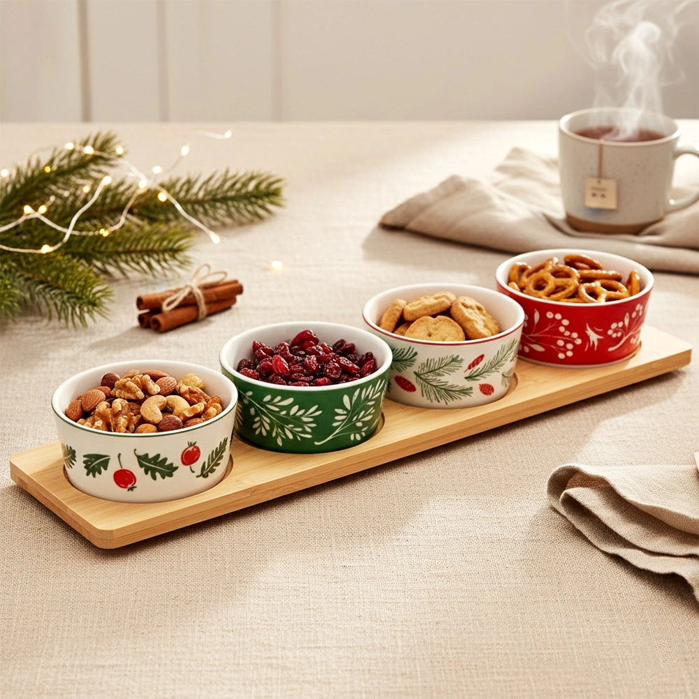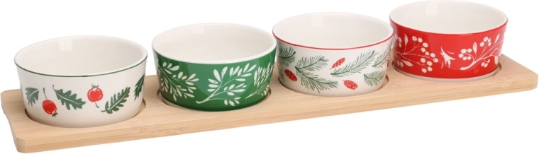 Stylová sada na servírování s bambusovým podnosem a 4 porcelánovými miskami s vánočními motivy. Ideální pro oříšky, olivy, dipy a drobné občerstvení během svátečních setkání. Stabilní vybrání v podnosu brání posunu misek, porcelánové misky lze mýt v myčce. Rozměr podnosu 38 × 10 × 4,5 cm, miska 8,5 × 4 cm, objem 140 ml.