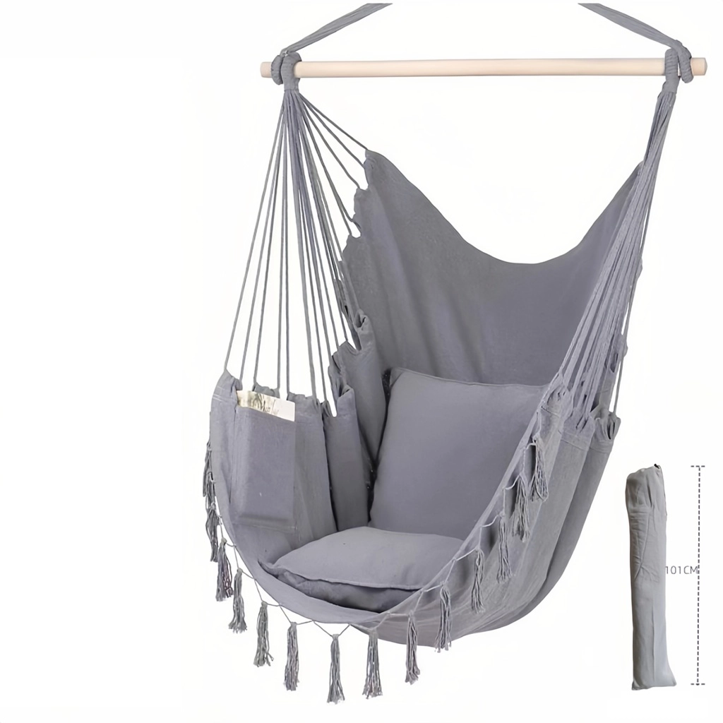 Elegantní závěsné houpací křeslo v neutrální šedé barvě přináší do každého prostoru pocit klidu a lehkosti. Přírodní bavlněná tkanina je prodyšná, měkká na dotek a odolná pro každodenní používání. Díky jemnému houpání účinně uvolňuje tělo i mysl – ideální po náročném dni.