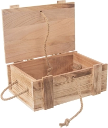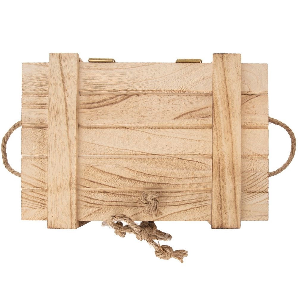 Stylová dřevěná bedýnka s víkem o rozměrech 36 × 26 × 16 cm je ideální pro domácí organizaci i dárkové balení. Nabízí praktické úložné řešení, je lehká a odolná, má jutové uzavírání a boční provazová držadla pro snadné přenášení.
