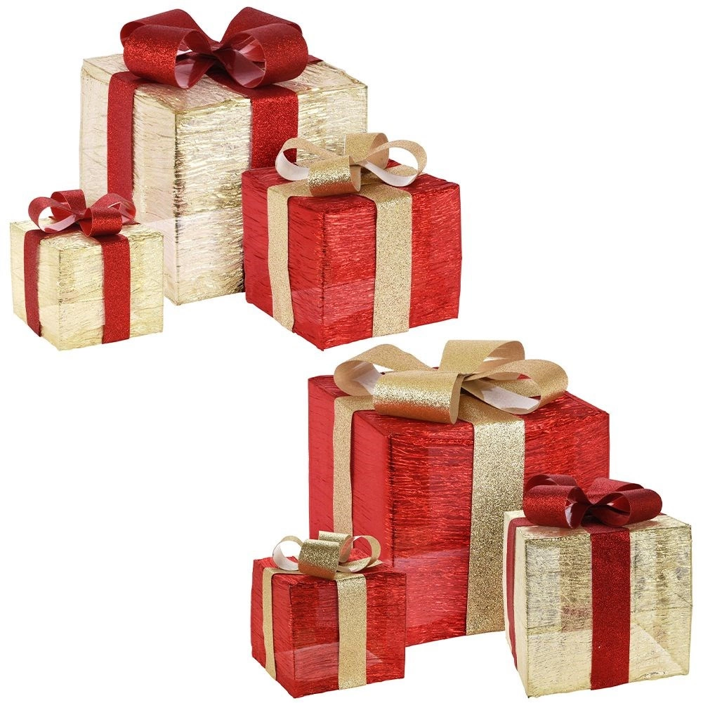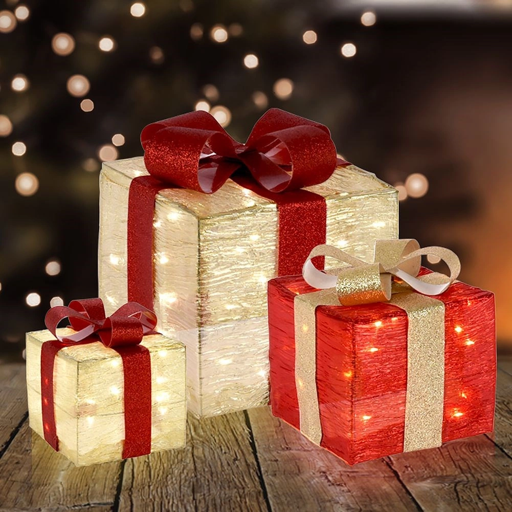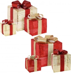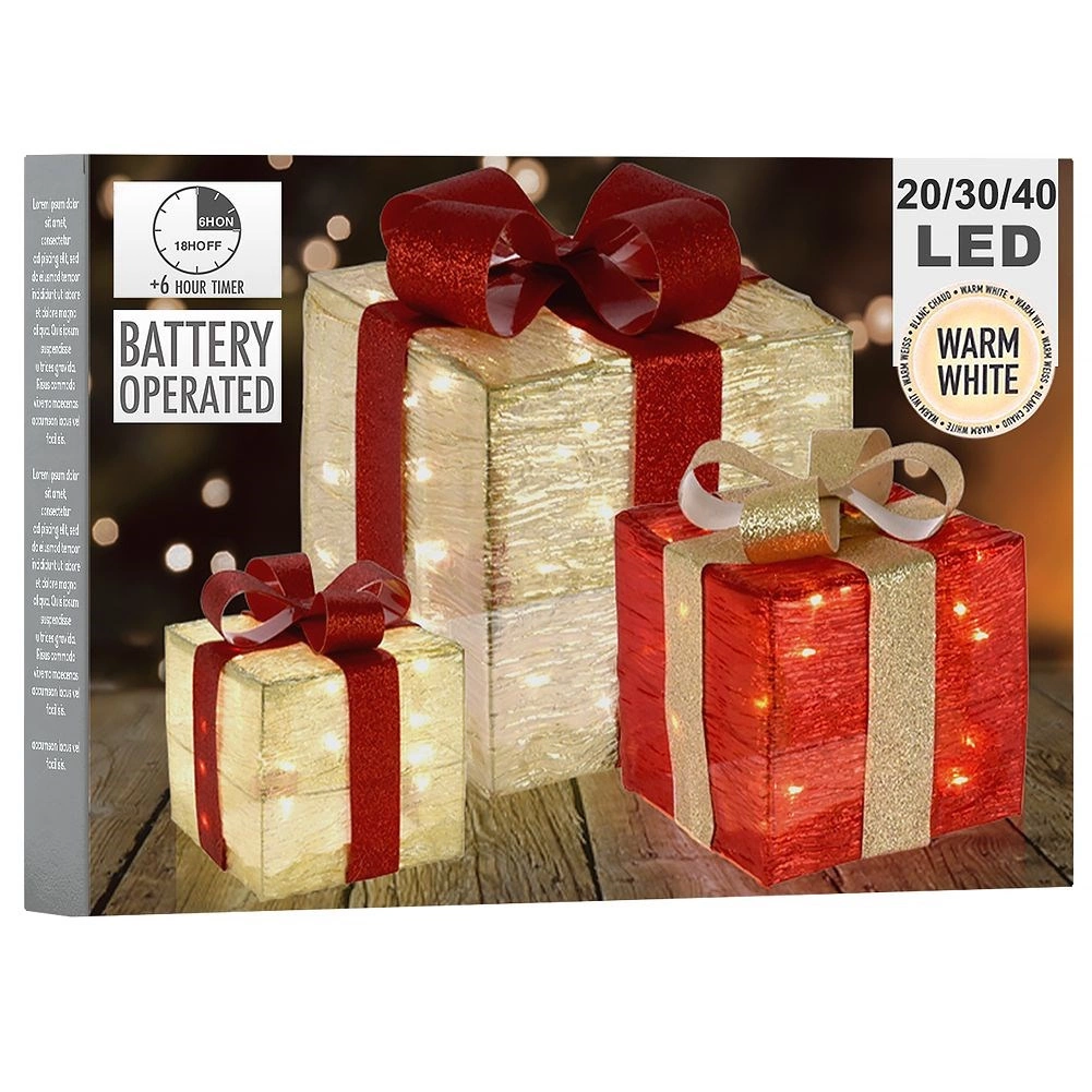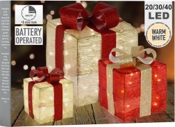 Elegantní sada tří svítících dárkových krabic v kombinaci zlaté a červené barvy nádherně podtrhne vánoční výzdobu doma, v kanceláři i v restauraci. Každá krabice je omotaná glitterovou stuhou s mašlí a má teplé bílé LED, které navodí kouzelnou atmosféru.