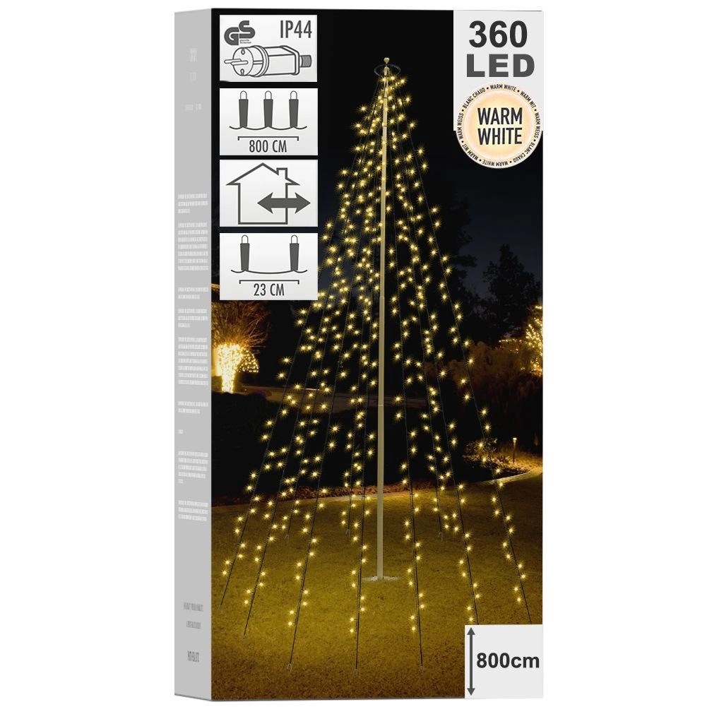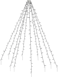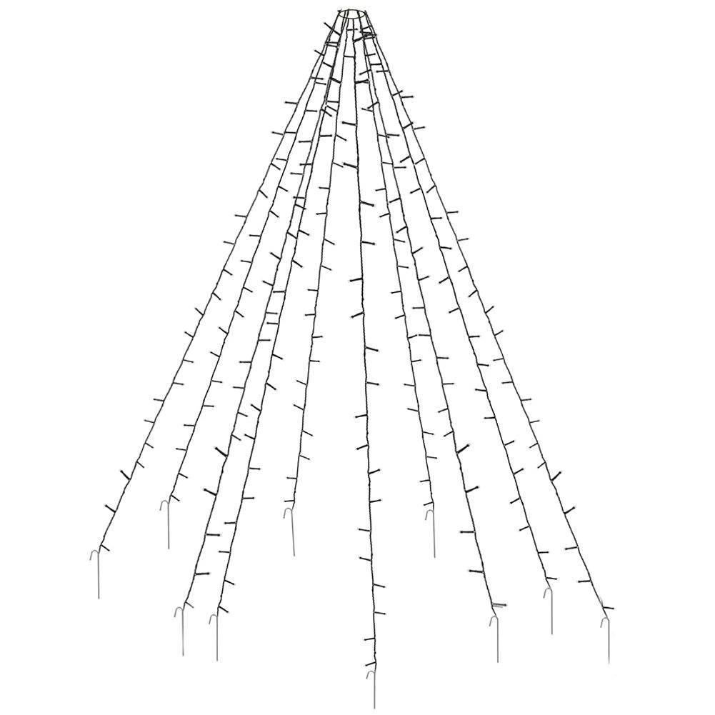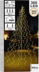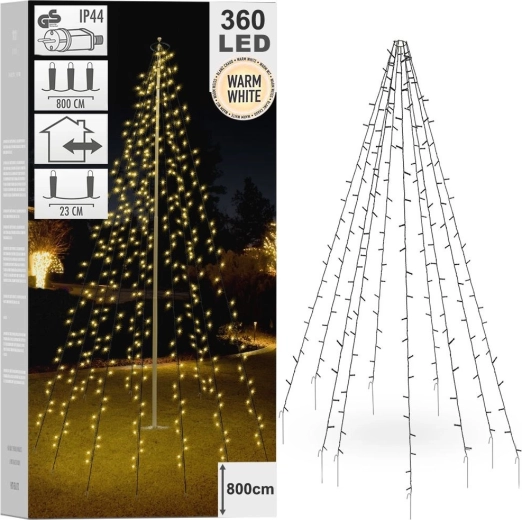 Světelná dekorace tvořená deseti řetězy zavěšenými na kovovém kroužku vytváří působivý tvar stromku. Každý řetěz má 36 LED v teplé bílé barvě a délku 8 m, takže výsledný efekt je výrazný a viditelný i z větší vzdálenosti. Osvětlení je vhodné pro použití venku i uvnitř.