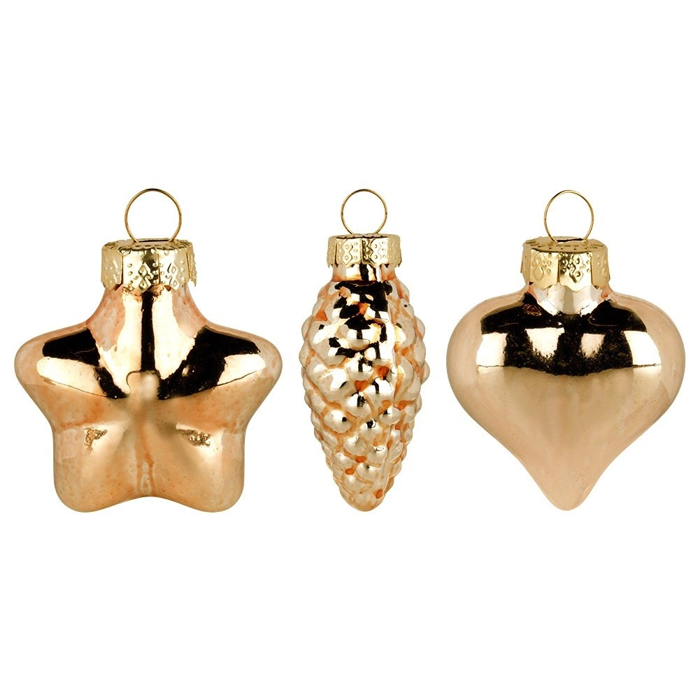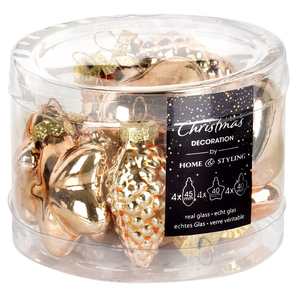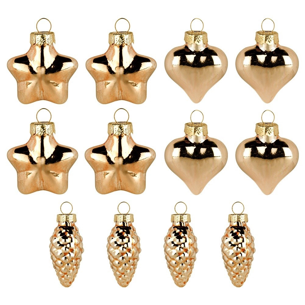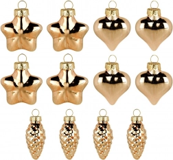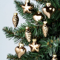 Elegantní sada 12 skleněných vánočních ozdob v luxusní zlaté barvě rozzáří každý stromek i sváteční výzdobu. Kombinace tvarů srdíček, hvězdiček a šišek o velikosti 4–4,5 cm vytváří harmonický a stylový celek. Ozdoby jsou z pravého skla, mají lesklý, vysoce odrazivý povrch a díky očkům se snadno zavěšují na větvičky, girlandy i věnce.