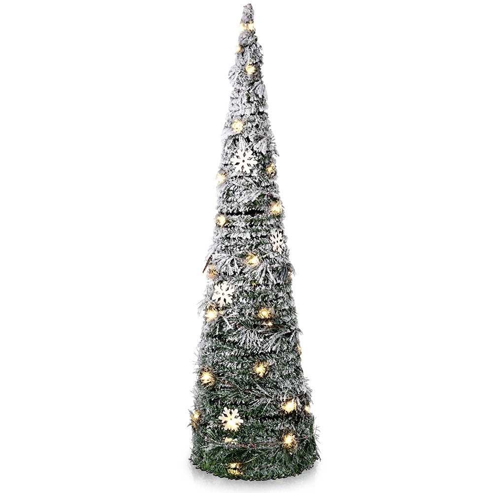 Elegantní kuželová vánoční dekorace vysoká 80 cm s 40 teplými LED přinese do vašeho domova kouzelnou zimní atmosféru. Díky efektu sněhového poprašku a dřevěným vločkám působí přirozeně a útulně, má úsporné bateriové napájení a praktickou funkci časovače pro pohodlné používání.