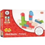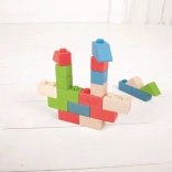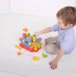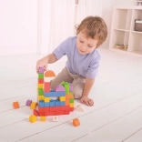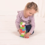 Dřevěná stavebnice Bigjigs Baby nabízí unikátní kombinaci dřevěných kostek a plastových spojek, které umožňují pevné a stabilní stavby. Kostky v různých tvarech a barvách jsou ideální pro dětské ručičky.