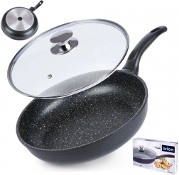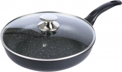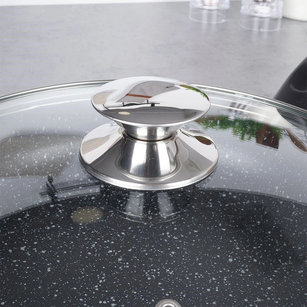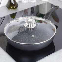 Silnostěnná pánev z hliníkového odlitku se vyznačuje masivní konstrukcí pro stabilní vedení tepla a dlouhou životnost. Kameninová/granitová nepřilnavá vrstva usnadňuje smažení i dušení, snižuje spotřebu oleje a umožňuje snadné čištění. Skleněná poklice s parním ventilem pomáhá udržet vlhkost a kontrolovat průběh vaření.