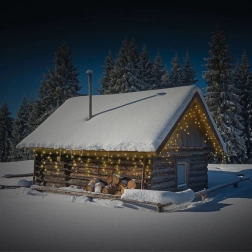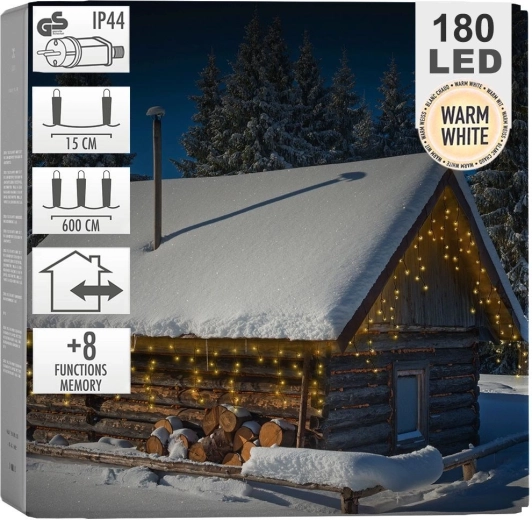 Elegantní světelná kurtyna o délce 5,85 m s 180 LED v teple bílé barvě rozzáří fasádu, terasu i interiér. Nabízí 8 světelných režimů s pamětí, bezpečnostní krytí IP44 a síťové napájení s 3m přívodním kabelem. Zelený kabel decentně splyne s venkovními dekoracemi a zajistí efektní vzhled během celé sváteční sezóny.