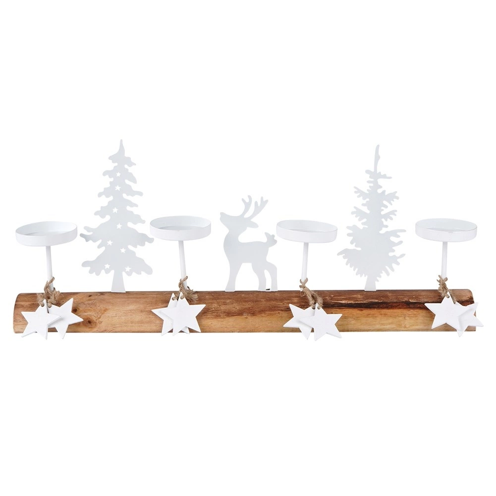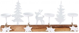 Tento stylový svícen v kombinaci přírodního dřeva a matně bílého kovu je ideální volbou pro zimní a vánoční výzdobu. Kovové siluety stromků, jelena a zavěšených hvězdiček působí efektně na jídelním stole, komodě i na okenním parapetu. Díky čtyřem talířkům je perfektní jako adventní dekorace.