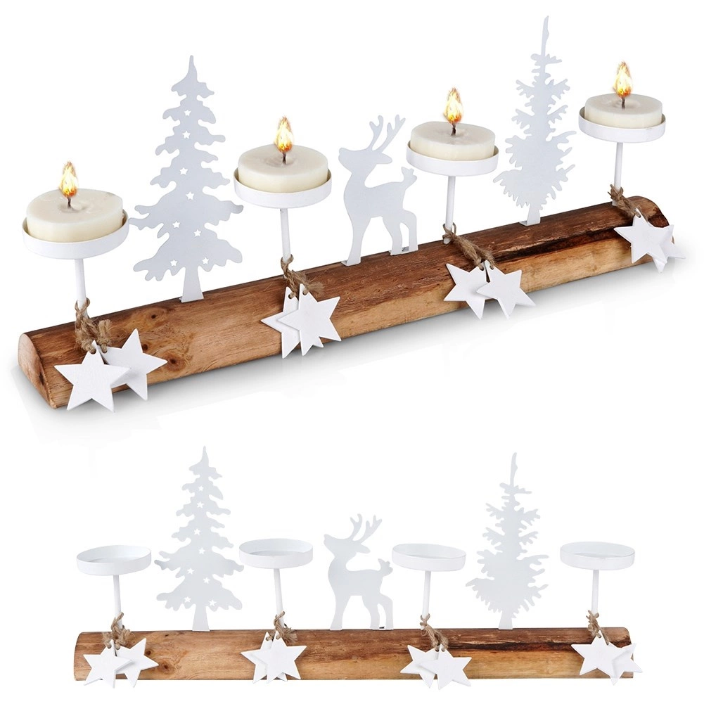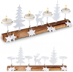 Elegantní svícen s přírodní dřevěnou základnou a bílými kovovými siluetami stromečků a jelena vytvoří útulnou sváteční atmosféru u vás doma. Pojme 4 čajové svíčky (až do průměru 5 cm), je stabilní a odolný, a skvěle se hodí jako adventní svícen i celosezónní dekorace v moderním i klasickém interiéru.