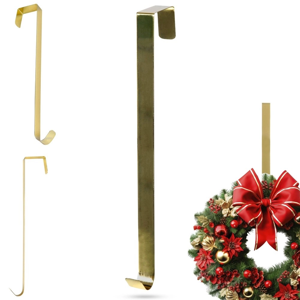Elegantní zlatý věšák na věnec o výšce 30 cm pro zavěšení dekorací přes horní hranu dveří. Nabízí snadnou instalaci bez nářadí, pevné kovové provedení a efektní zlatý vzhled, který zvýrazní vánoční, zimní i podzimní ozdoby. Vhodný pro dveře do šířky 5 cm a použití v interiéru nebo pod přístřeškem.