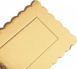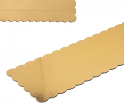 Elegantní zlatá podložka pod dort o rozměru 33 × 12 cm se zdobným vlnkovaným okrajem. Je oboustranná, vyrobená z pevné kartonáže a potažená ochrannou fólií z obou stran, takže odolá vlhkosti a je vhodná i do lednice. Poskytuje stabilní oporu pro přenášení a bezpečný transport dortů i těžších zákusků a současně zajišťuje reprezentativní servírování.