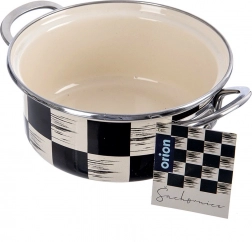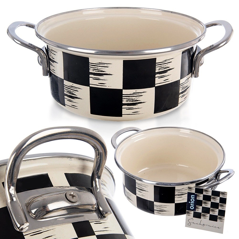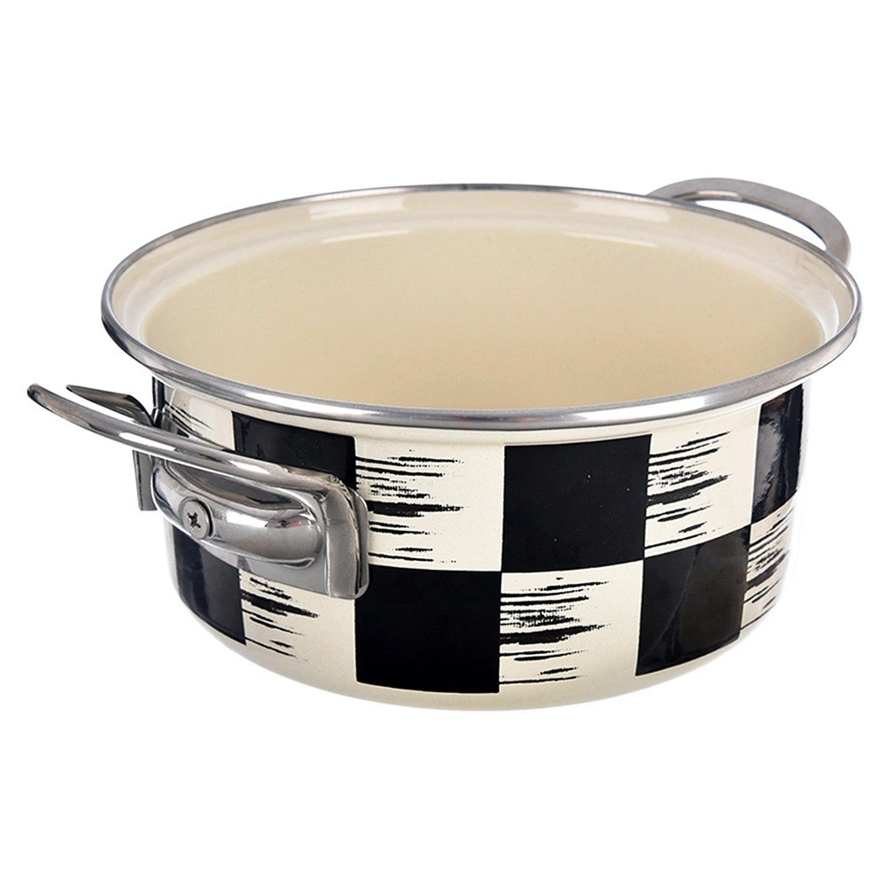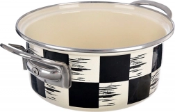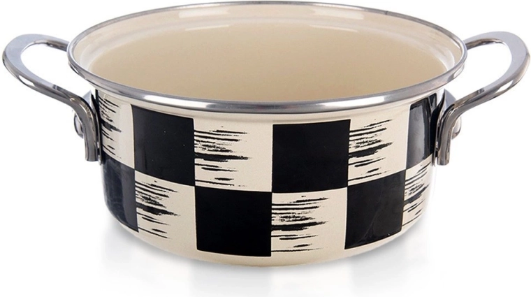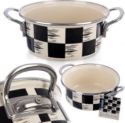 Emaliovaný hrnec v retro stylu kombinuje nadčasový design s vysokou odolností. Vnější strana s efektním vzorem šachovnice v černo-béžovém provedení a vnitřní béžový povrch zajišťují elegantní vzhled při servírování přímo na stůl. Rolovaný okraj z nerezové oceli a masivní kovová ucha přidávají na trvanlivosti a bezpečném uchopení.