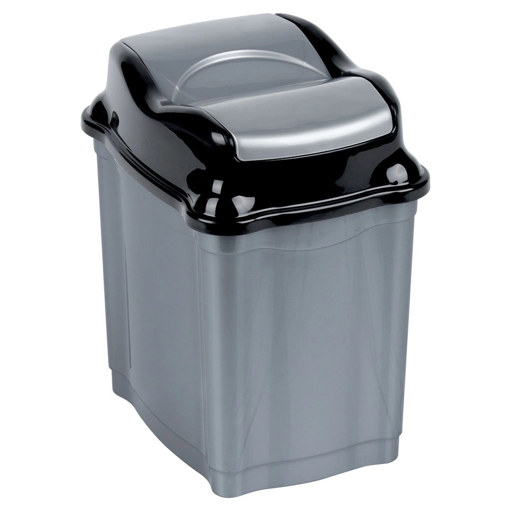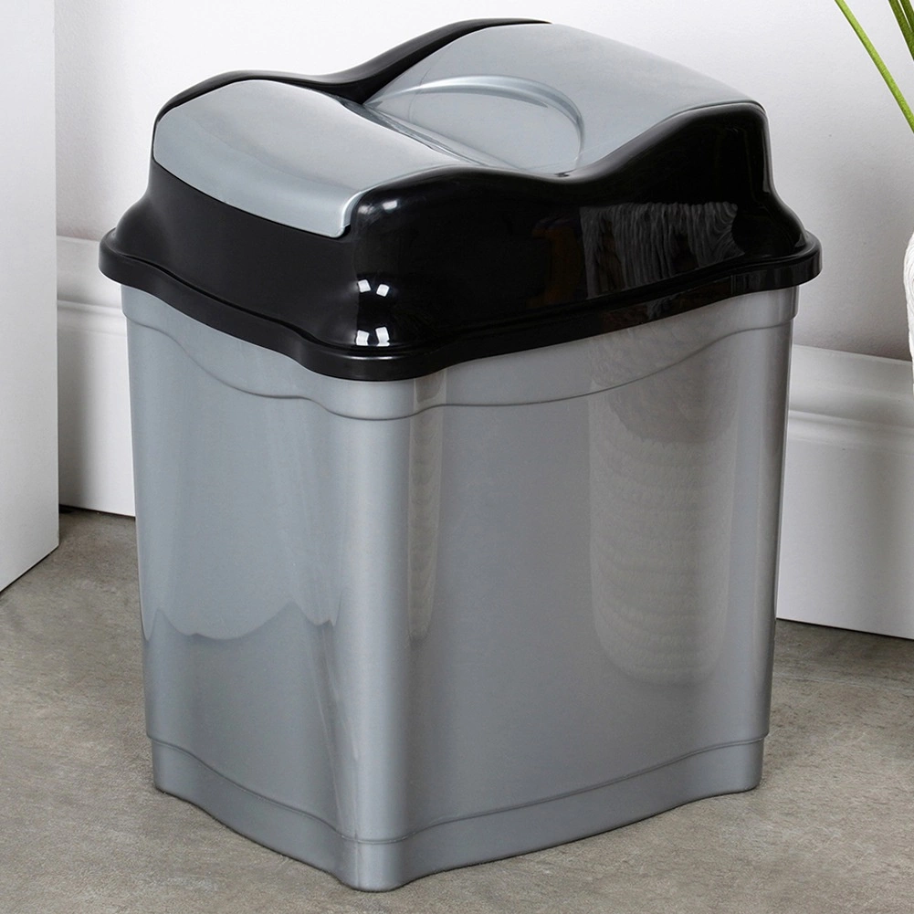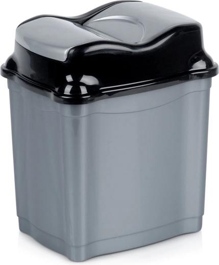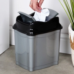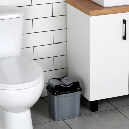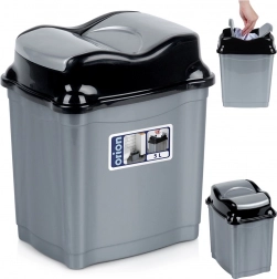 Kompaktní plastový odpadkový koš o objemu 5 l se sklopným víkem je ideální do koupelny, kuchyně i kanceláře. Díky odolnému plastu, lehkému provedení a snadnému čištění udrží pořádek a zamezí šíření zápachu. Minimalistický šedý design s černým víkem se hodí do každého interiéru.