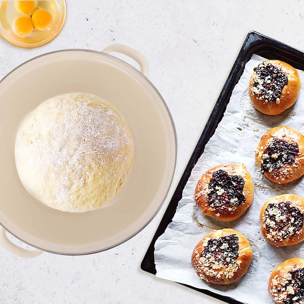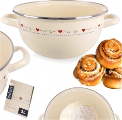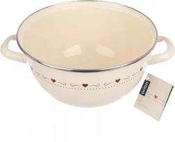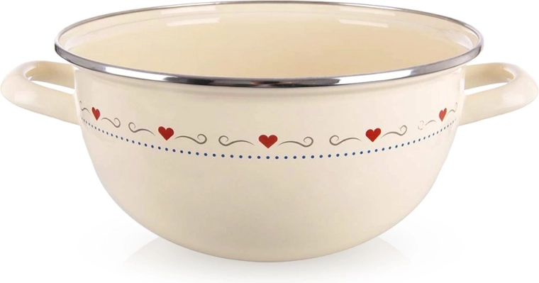 Praktická emajlovaná miska s objemem 5 l v krémové barvě s jemným motivem srdcí. Má pohodlné úchyty pro snadné přenášení, nerezový okraj a je vhodná do myčky. Skvěle se hodí na míchání, hnětení těsta i servírování a díky odolné smaltované oceli je zdravotně nezávadná a bezpečná i pro alergiky.