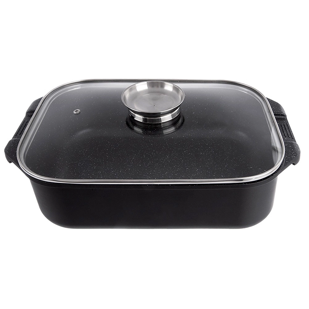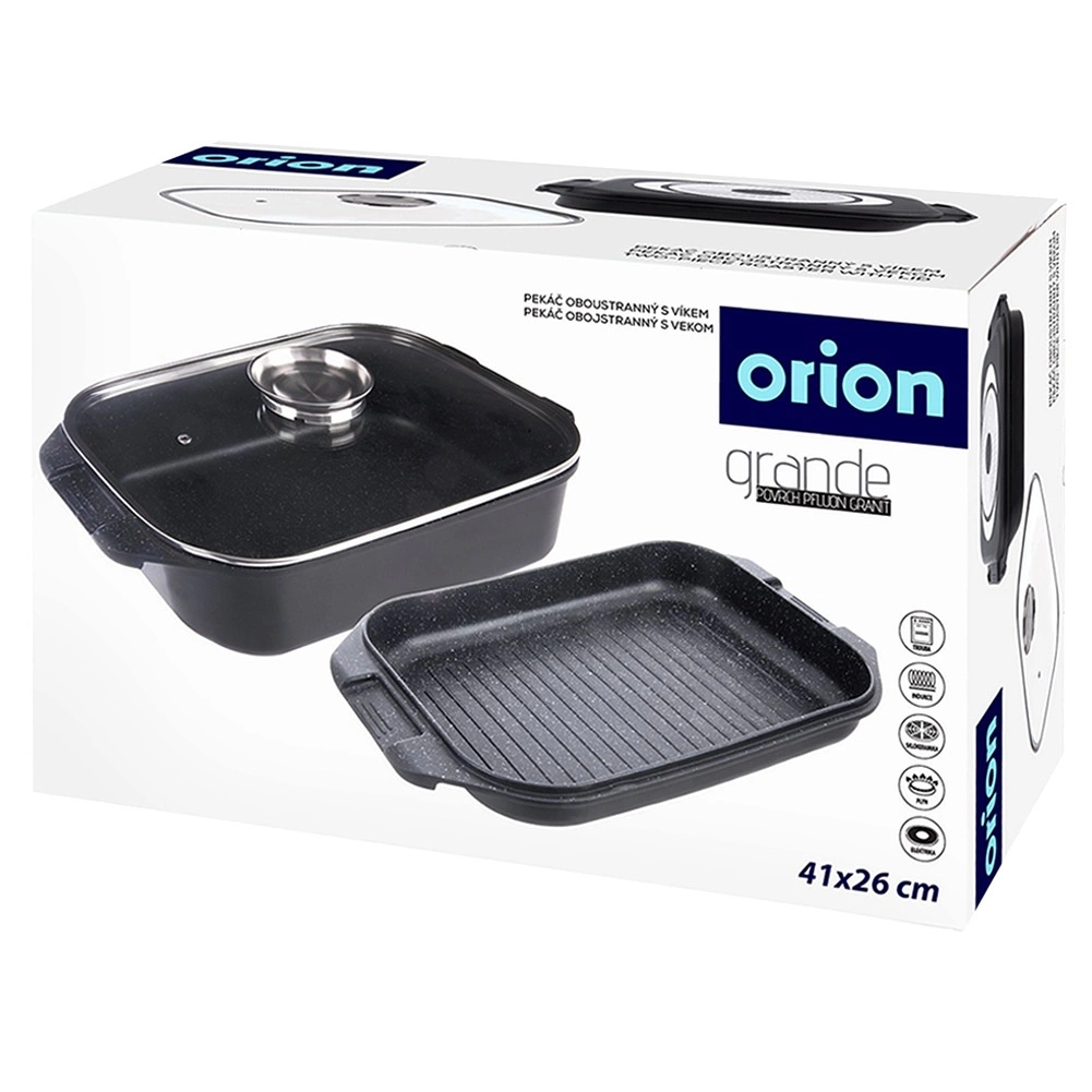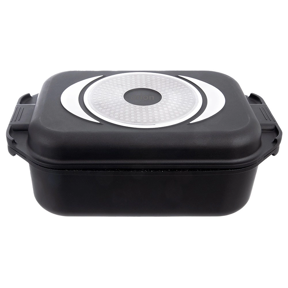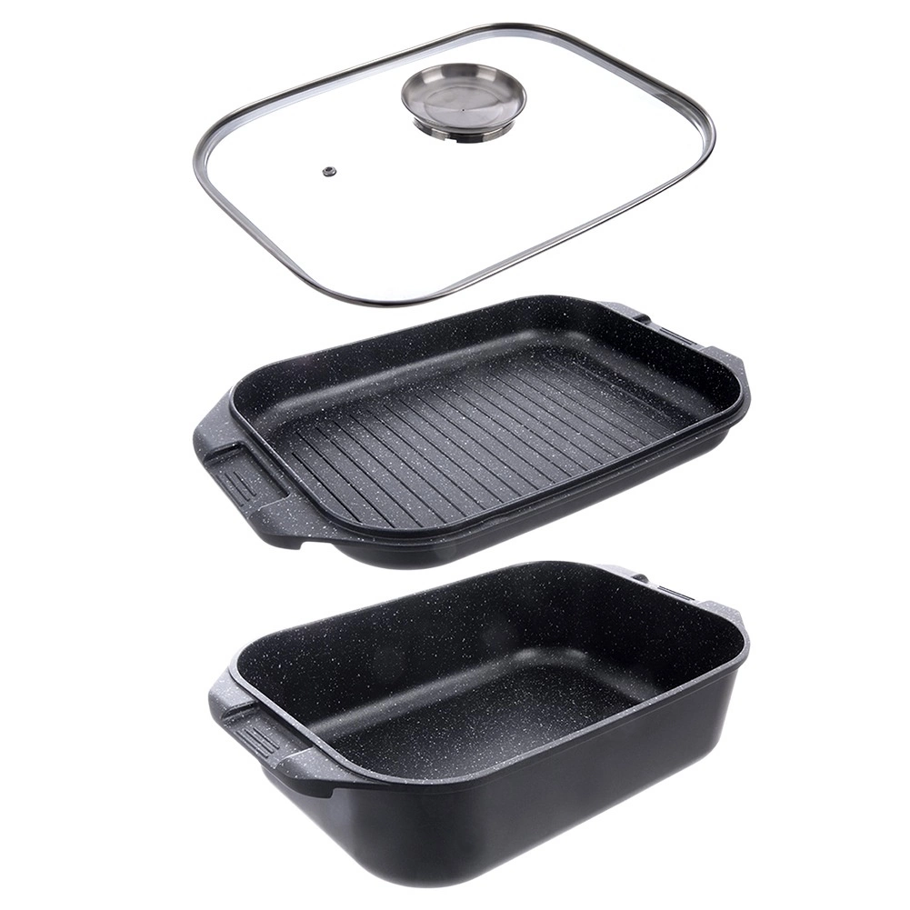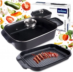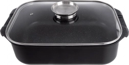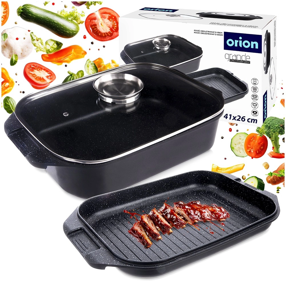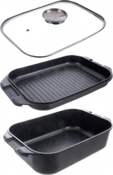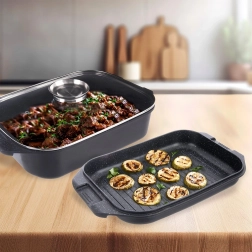 Univerzální sada pro každodenní vaření: prostorná brytfanna 7 l s víkem ve formě grilovací pánve a samostatným žáruvzdorným skleněným víkem s dávkovačem tekutých koření. Dvojitá granitová vrstva PFLUON GRANIT na hliníkovém odlitku zajišťuje skvělou nepřilnavost, rovnoměrný rozvod tepla a snazší čištění.