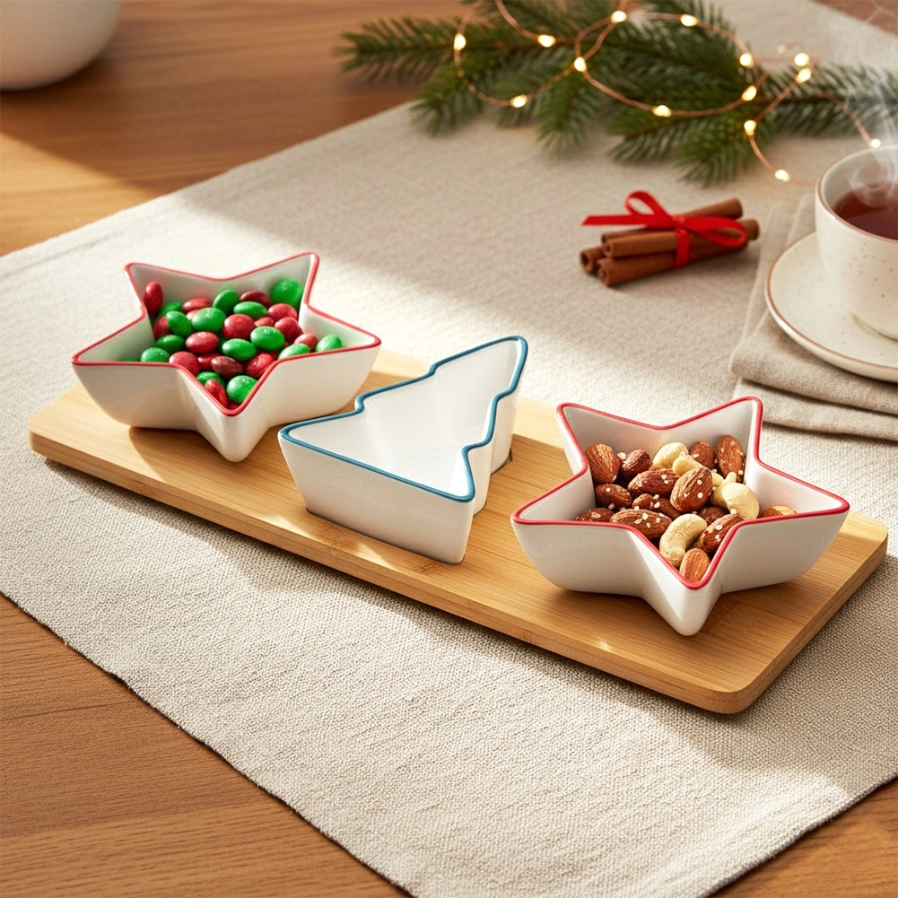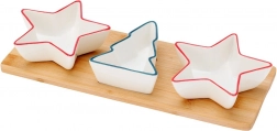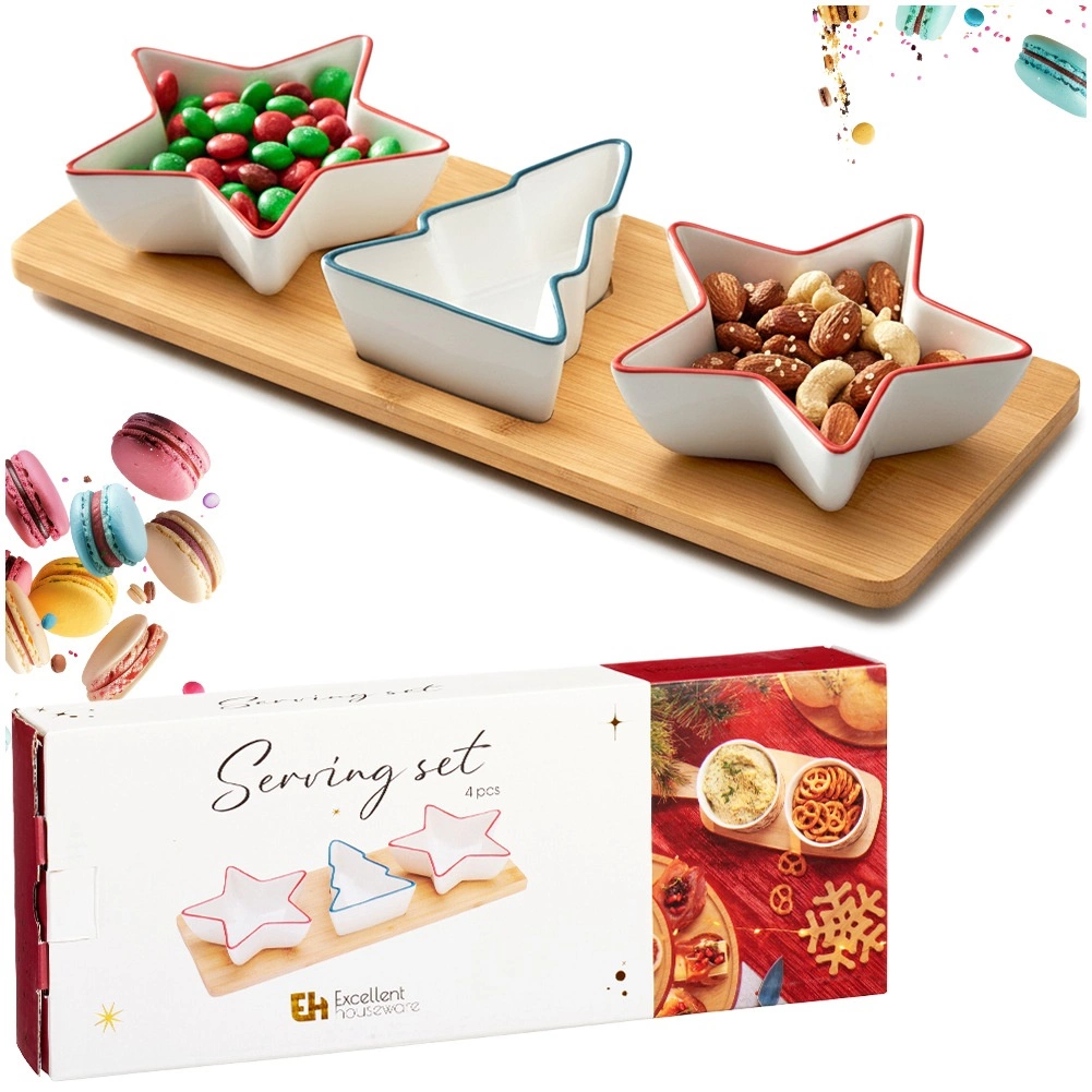 Elegantní sada na servírování s podnosem obsahuje tři porcelánové mističky – dvě ve tvaru hvězdy a jednu ve tvaru stromečku – a obdélníkový bambusový tác. Ideální pro oříšky, olivy, dipy a předkrmy během svátečních setkání. Kvalitní porcelán v bílé barvě a stabilní bambusový podnos s vybráními pro lepší fixaci misek. Misky lze mýt v myčce (bez podnosu).