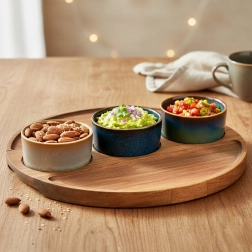 Reaktivní glazura dává každé misce originální odstín a vzor, takže váš stůl bude vždy vypadat výjimečně. Podnos z akáciového dřeva dodává teplý přírodní akcent a usnadňuje pohodlné přenášení. Mističky lze používat samostatně a po hostině je jednoduše vložíte do myčky.