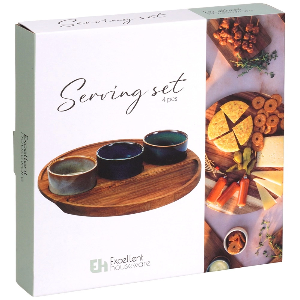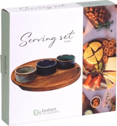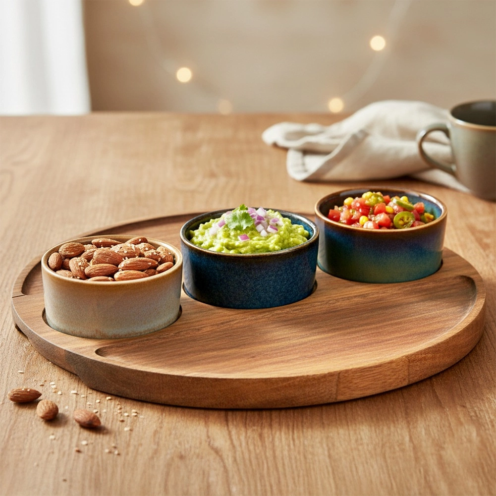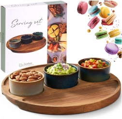 Stylová 4dílná sada na servírování s dřevěným podnosem a třemi keramickými mističkami je ideální pro olivy, oříšky, dipy a antipasti. Každá miska má unikátní glazuru, podnos z akáciového dřeva má vyfrézované prohlubně pro stabilitu. Rozměry setu 25 × 25 × 4,5 cm, mističky 7 × 3 cm, objem 65 ml. Mističky jsou vhodné do myčky (bez podnosu).