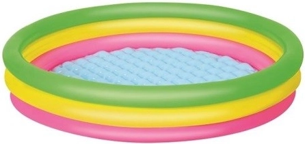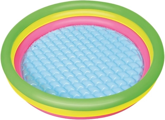 Duhový kruhový bazének z odolného vinylu přináší pohodlí i jistotu při dětských vodních radovánkách. Měkké, nafukovací a texturované dno tlumí došlapy a izoluje od chladu země, takže je skvělý jak na trávník, tak na terasu. Tři samostatně nafukované prstence drží tvar a zvyšují stabilitu konstrukce.