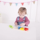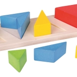 Jednoduché tvary a jasné barvy (červená, modrá, zelená, žlutá) podporují zrakové vnímání i logické třídění. Vkládání do odpovídajících pozic posiluje správné přiřazování.
