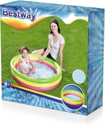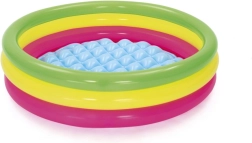 Lehký a skladný bazének s průměrem 102 cm a výškou 25 cm je skvělou volbou pro děti od 2 let. Tři barevné prstence s oddělenými ventily zajišťují stabilitu a bezpečí při hraní, zatímco nafukovací dno poskytuje extra komfort i na tvrdších površích. Kapacita 62 litrů je akorát pro příjemné ochlazení a první vodní hry.