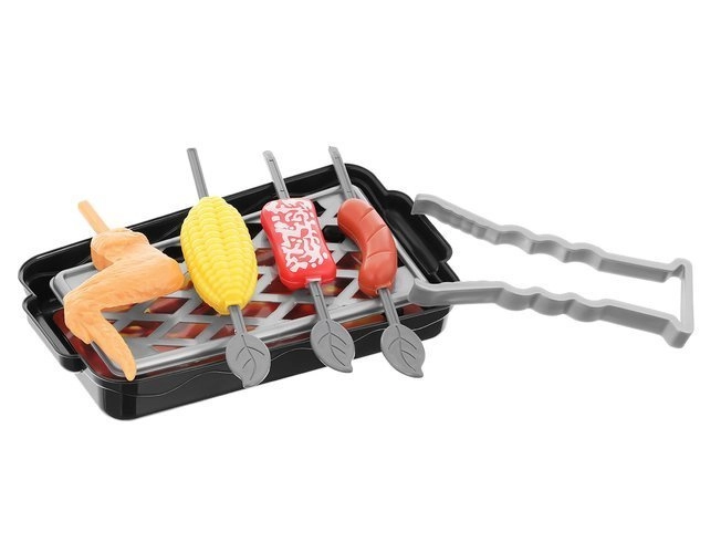 V balení najdete mimo jiné gril s roštem, indukční vařič, tlakový hrnec a hrnec, pánev, konvici, prkénko a bezpečné nože, náčiní (naběračky, špachtle, kleště), nádobí (misky, talířky, hrnečky) i „potraviny“ a koření pro realistickou hru.