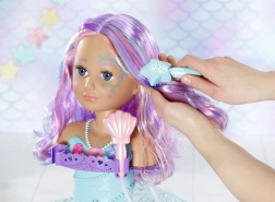 Česací hlava BABY born Sister Mořská víla promění každou koupel v podmořský kadeřnický salon. Přisaje se k vaně pomocí pevných přísavek a po vyjmutí mušlové sprchové hlavice se aktivuje čerpadlo – voda skutečně teče, pokud je hlava ve vodě. Snadno otočná hlava s malovanými detaily obličeje láká k líčení a hrám na kosmetický salon.
