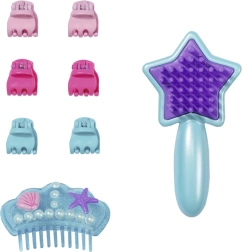 Dlouhé barevné vlasy s kvalitními prameny lze opakovaně česat a upravovat do nových účesů. Nechybí odkládací plocha na doplňky, držáky na kartáč ve tvaru hvězdice a sprchovou hlavici, čelenkový hřeben a 6 sponek. Hra rozvíjí představivost, zručnost i kreativitu a skvěle zabaví ve vaně i mimo ni.