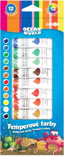 Sada kvalitních temperových barev Ocean World nabízí 12 sytých odstínů v tubách o objemu 12 ml – ideální pro školní projekty, domácí tvoření i začínající umělce. Vhodné pro děti od 3 let.
