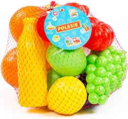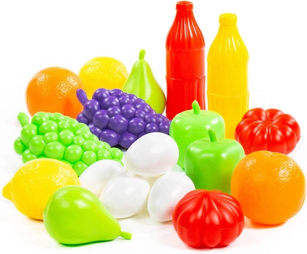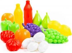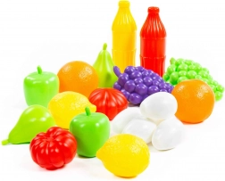 Sada obsahuje hrozny, jablka, citrusy, rajčata a další kousky, které podněcují fantazii a učí děti rozlišovat druhy potravin a barvy.