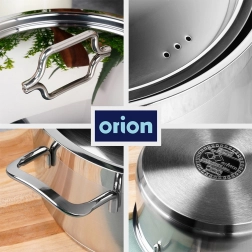 Hrnec je vyroben z prvotřídní nerezové oceli 18/10 s matným povrchem a lesklým páskem. Silné stěny a pevné úchyty zaručují dlouhou životnost a odolnost.