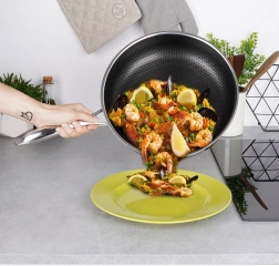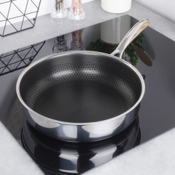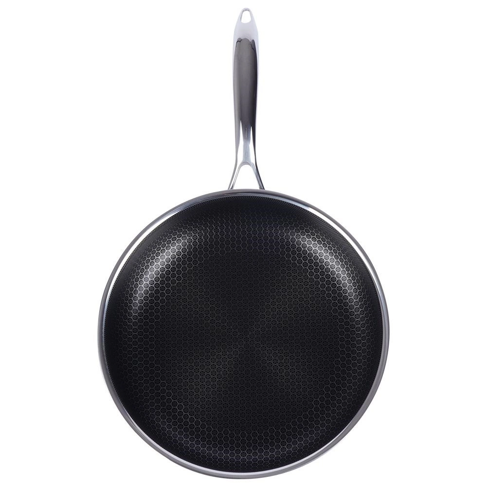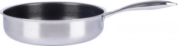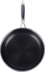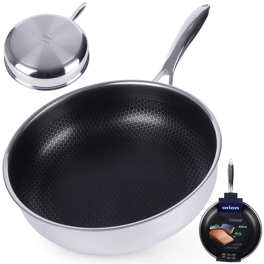 Prémiová nerezová pánev COOKCELL s průměrem 28 cm a hybridní nepřilnavou povrchovou úpravou s voštinovou strukturou zajistí rychlé a rovnoměrné smažení, je odolná proti poškrábání, vhodná pro indukci i troubu do 260 °C a lze ji mýt v myčce.
