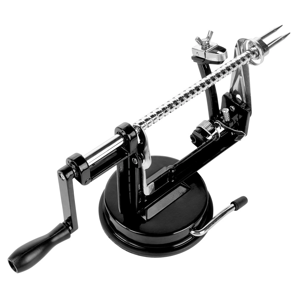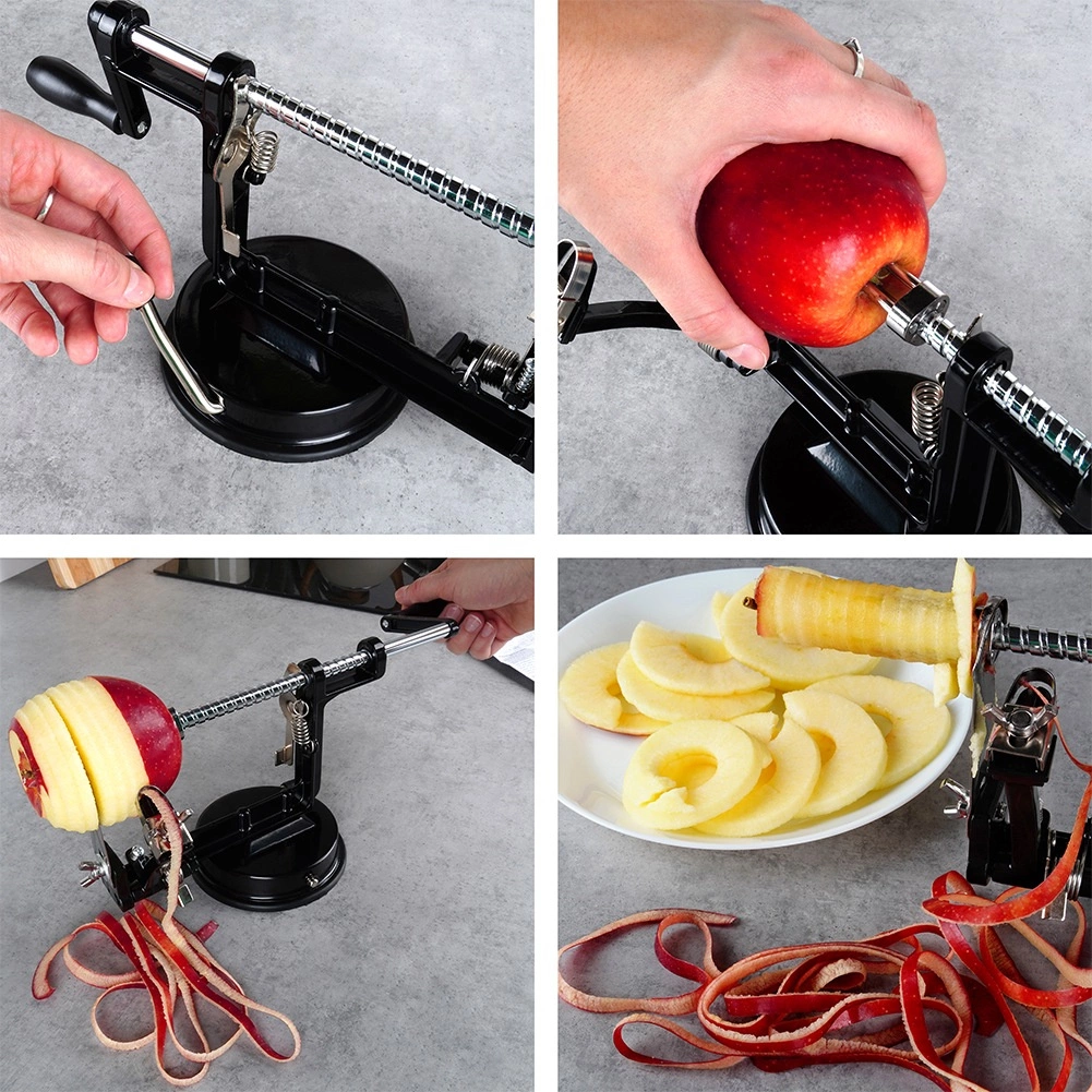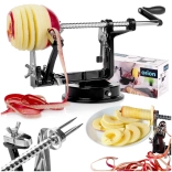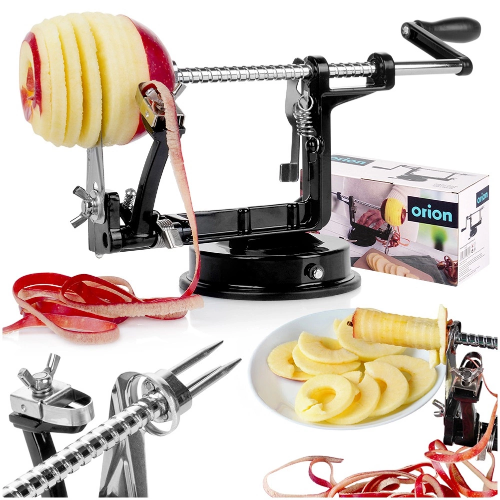 Praktický kuchyňský pomocník, který v jedné operaci oloupe, vykrojí jádřinec a nakrájí jablka, hrušky či brambory na efektní spirály. Díky přesnému vedení a ostrým nožům získáte pravidelné plátky ideální na štrúdly, křupavé chipsy, sušení či dekorativní servírování.