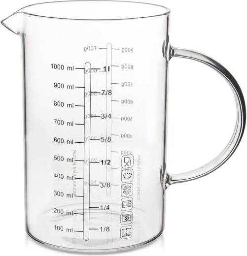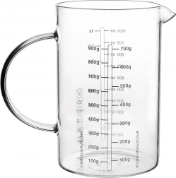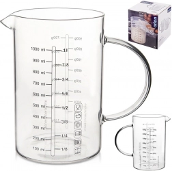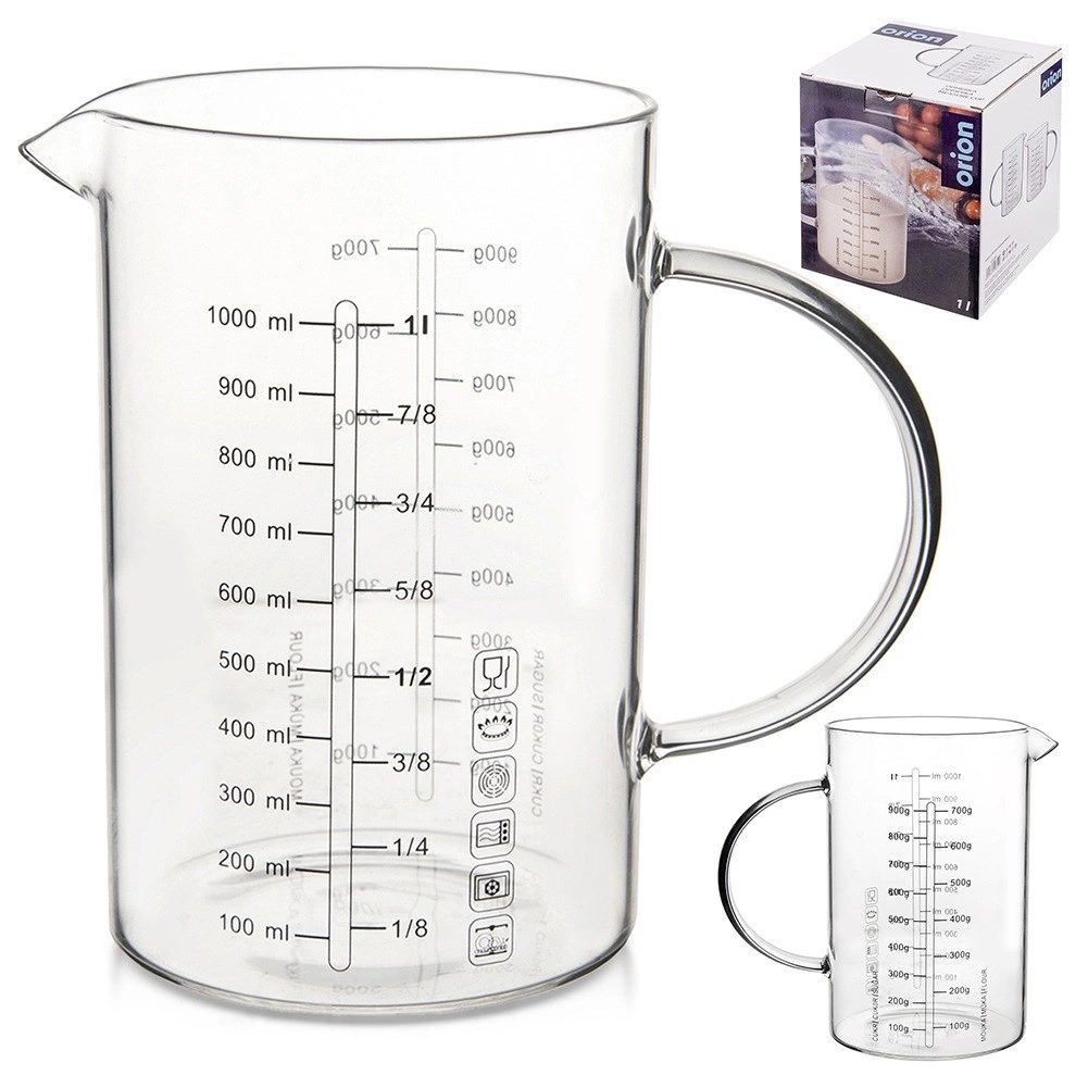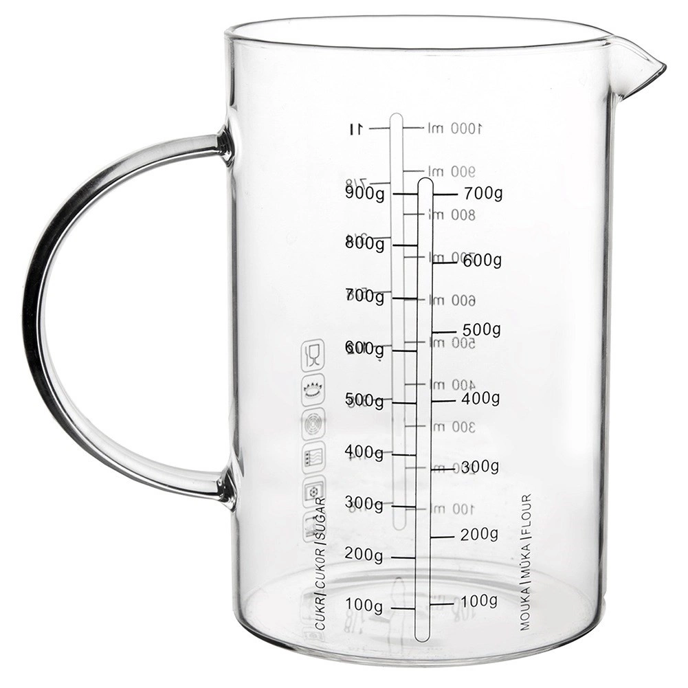 Skleněná odměrka ve formě džbánku je nepostradatelným pomocníkem do každé kuchyně. Díky ergonomickému uchu a praktickému zobáčku umožňuje přesné a čisté přelévání i sypání surovin. Vyrobená z odolného borosilikátového skla, zvládá široký rozsah teplot a hodí se pro každodenní vaření i pečení.