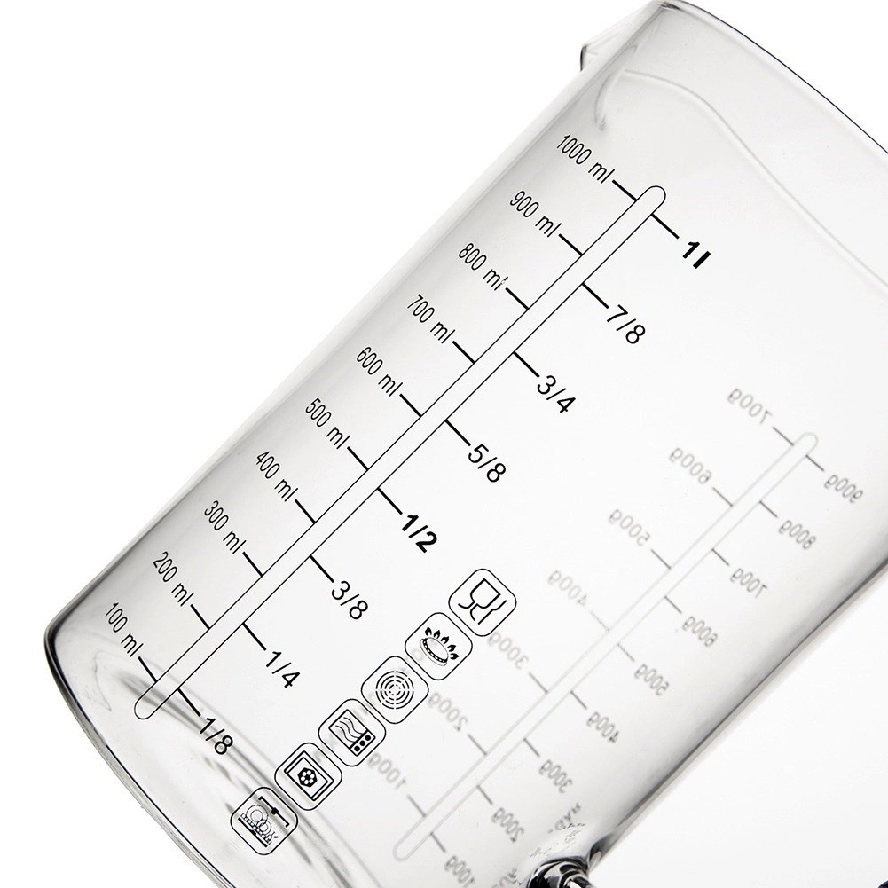 Stupnice jsou dobře čitelné a umožňují rychlé a spolehlivé odměřování. Najdete zde měření tekutin v ml (100–1000 ml) a v litrech (1/8 l – 1 l), stejně jako přepočty pro mouku (100–700 g) a cukr (100–900 g). Maximální označená kapacita je 1 l, skutečný objem džbánku je až 1,2 l.