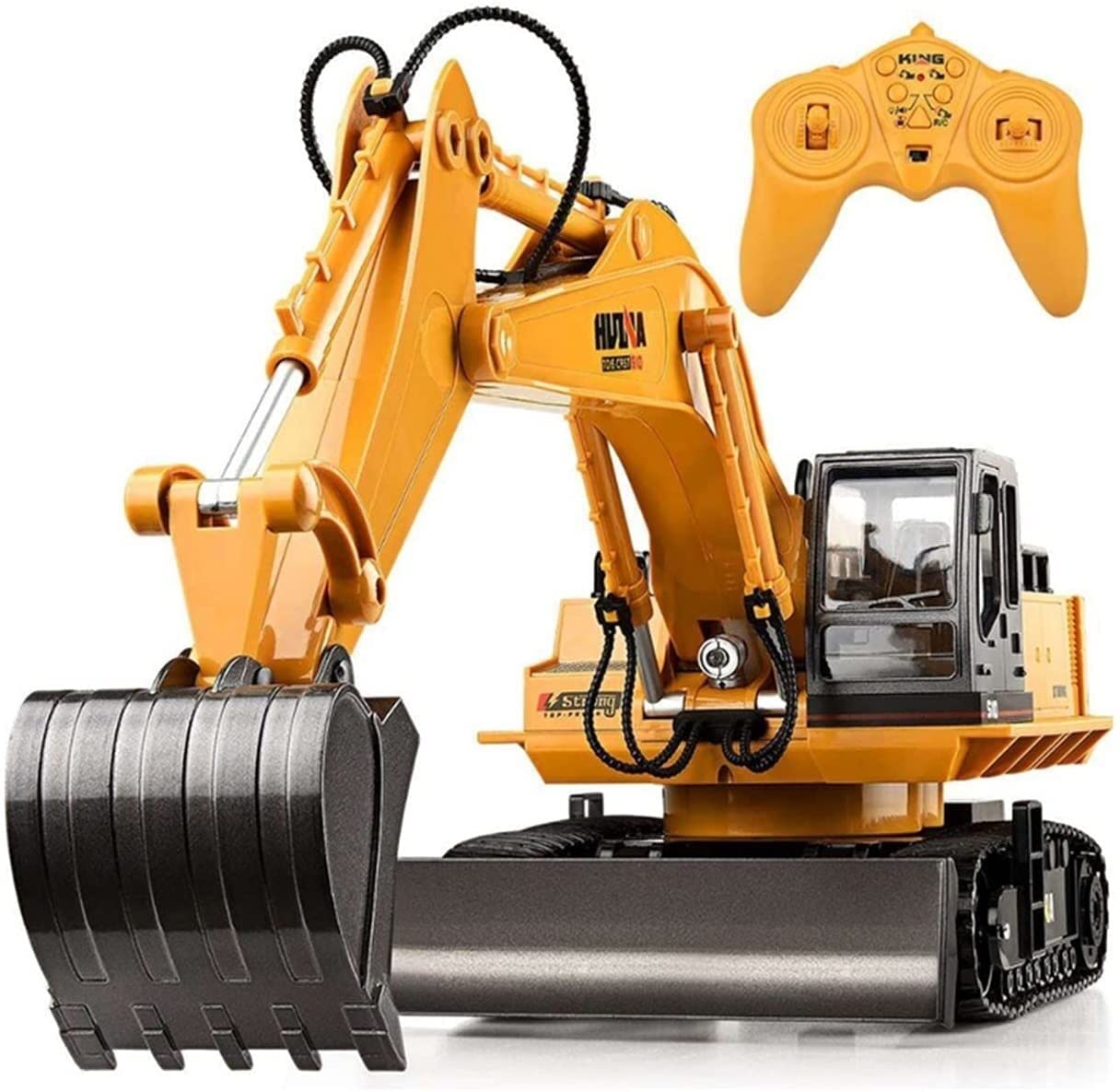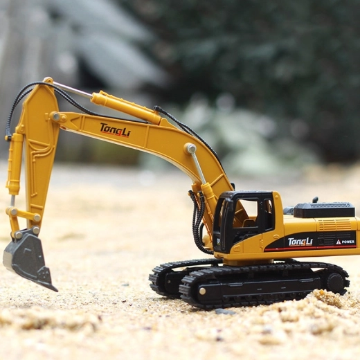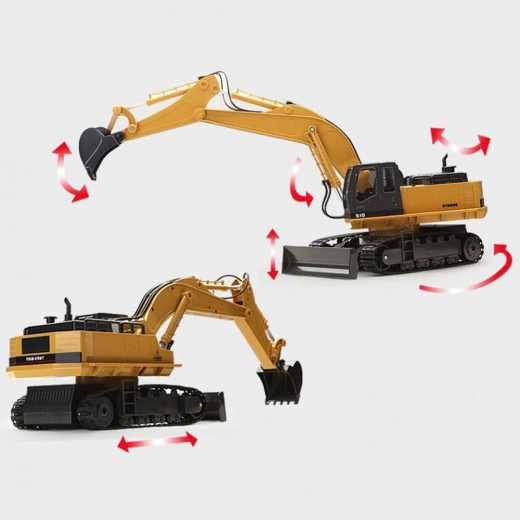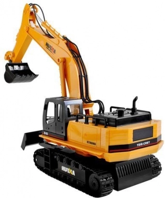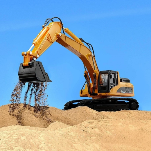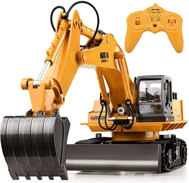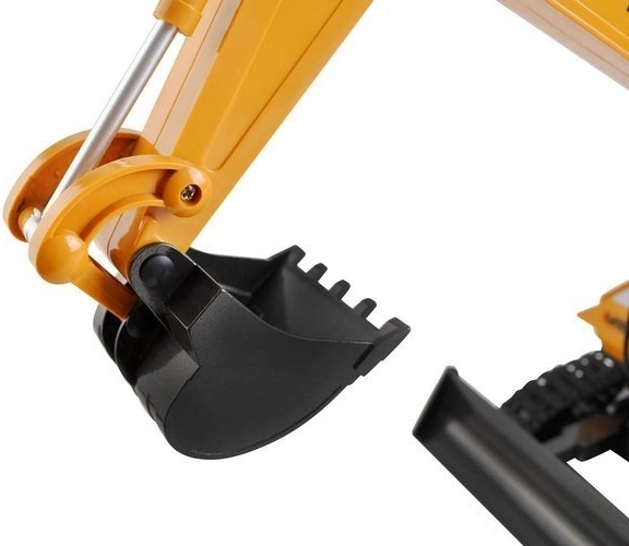 Dálkově ovládaný bagr má konstrukci charakteristickou pro masivní stavební vozidla a také klasické barevné schéma - žlutá karoserie je kombinována s mnoha detaily v kontrastní černé barvě.