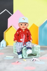 Stylový outfit pro panenky BABY born velikosti 36 cm s motorkářským nádechem: červená bunda v koženém vzhledu s potiskem medvídka, šedo‑modré kalhoty, modré tenisky a kšiltovka s kačenkou Bertou. Střih easy fit pro snadné převlékání, součástí je ramínko.