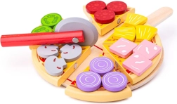 Šest plátků pizzy se spojkami na suchý zip drží pohromadě a lze je „ukrojit“ dřevěným kráječem. Děti si vyzkouší realistické krájení a servírování.