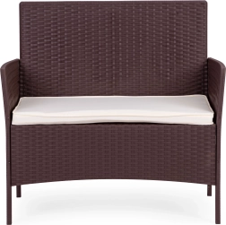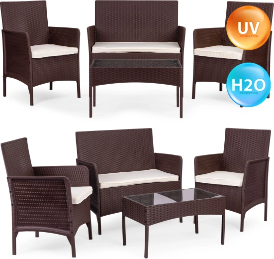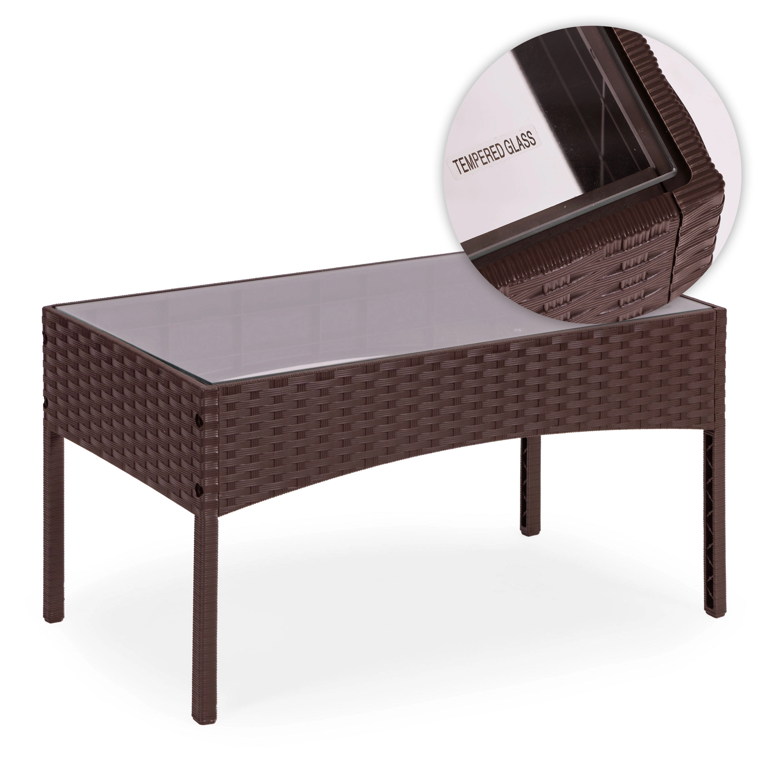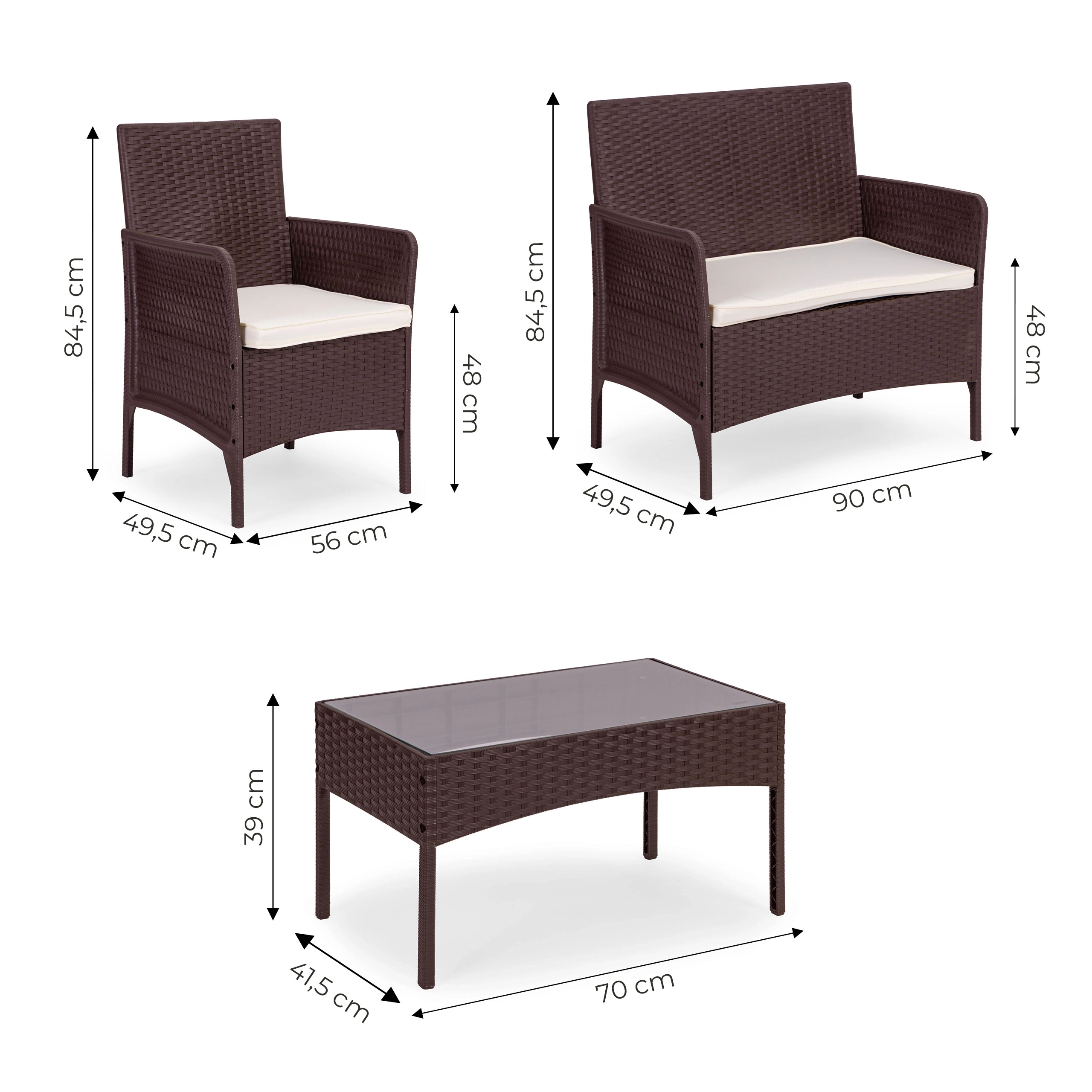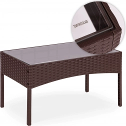 Vytvořte si příjemné místo k posezení a relaxu. Tato 4dílná zahradní souprava v hnědé barvě kombinuje vzhled technoratanu s praktickými výhodami odolného plastu. Je ideální pro každodenní používání na zahradě i terase a díky tvrzenému sklu na stolku získáte stabilní a bezpečnou odkládací plochu pro kávu i občerstvení.