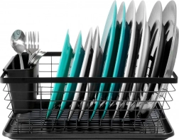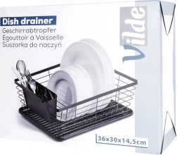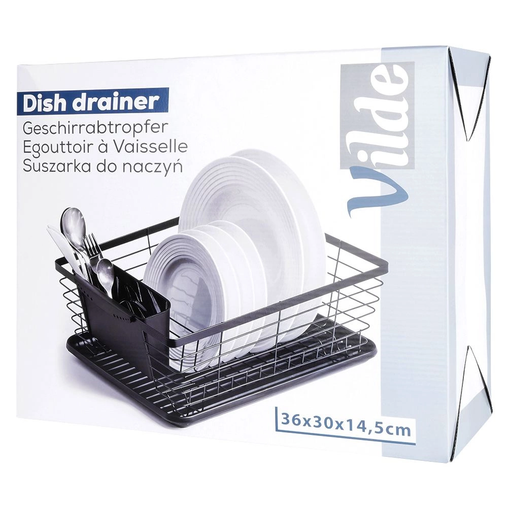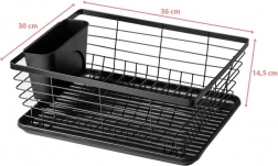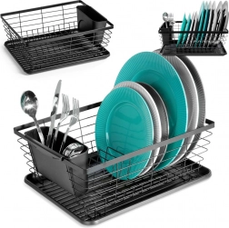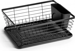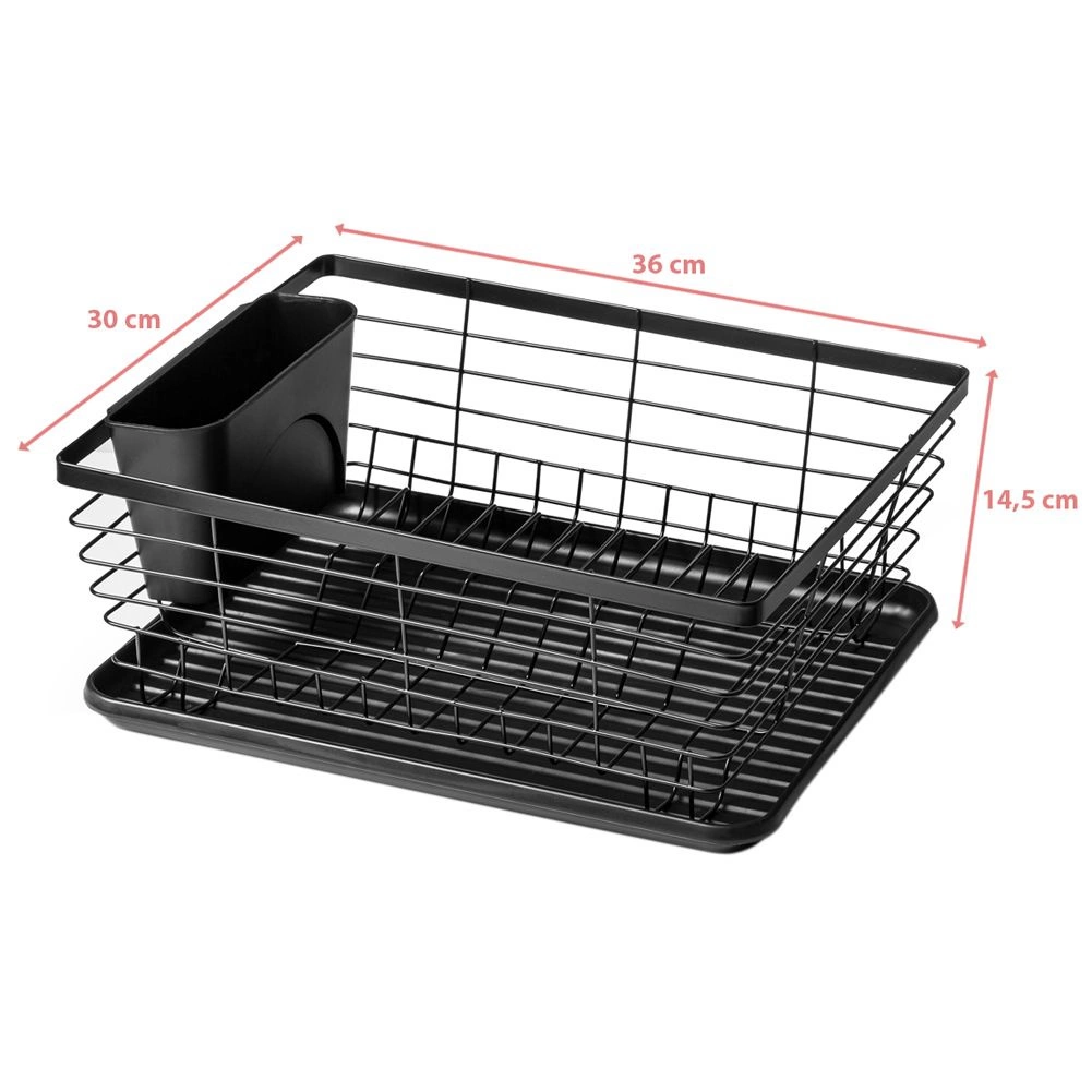 Praktický a stylový odkapávač na nádobí v černé barvě o rozměrech 36 × 30 × 14,5 cm. Díky vyjímatelné odkapávací misce a příborníku udrží vaši kuchyň v suchu a pořádku, šetří místo a zajišťuje rychlé a hygienické sušení talířů, sklenic i příborů.