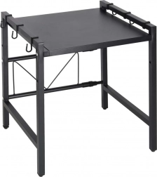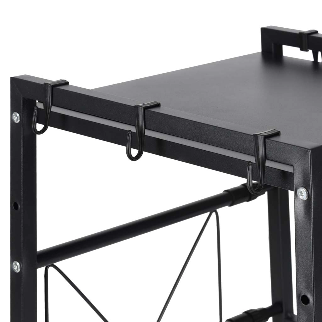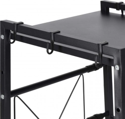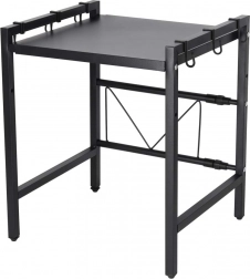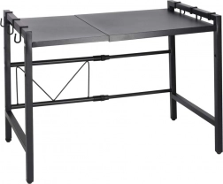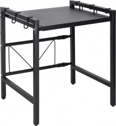 Součástí balení je vše potřebné pro rychlou montáž včetně 6 háčků na utěrky či náčiní a nastavitelných nožiček pro stabilitu. Při zasunuté šířce zvládne police nosnost až 30 kg, což zajišťuje spolehlivou oporu pro malé spotřebiče i těžší nádobí.