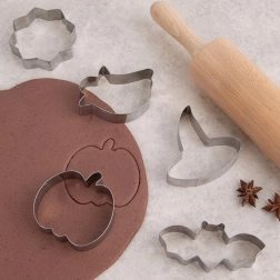 Vykrajovátka využijete nejen na těsto, ale také na fondán, marcipán či linecké, a klidně i na měkké potraviny jako sendviče, sýr nebo ovoce pro efektivní podávání dětem i na párty. Sada je připevněna na dekorativní karton ve tvaru dýně – skvělý dárek pro milovníky domácího pečení.