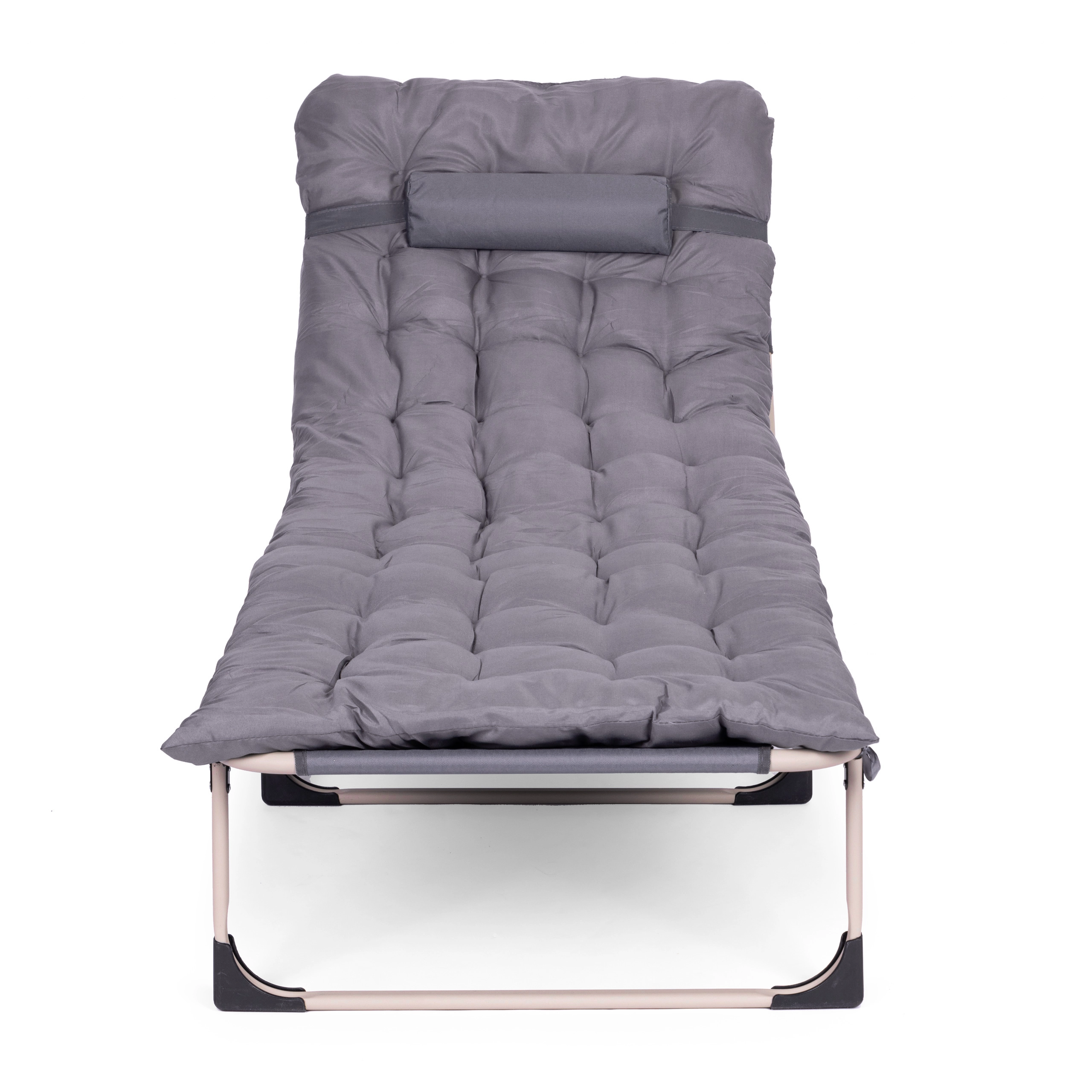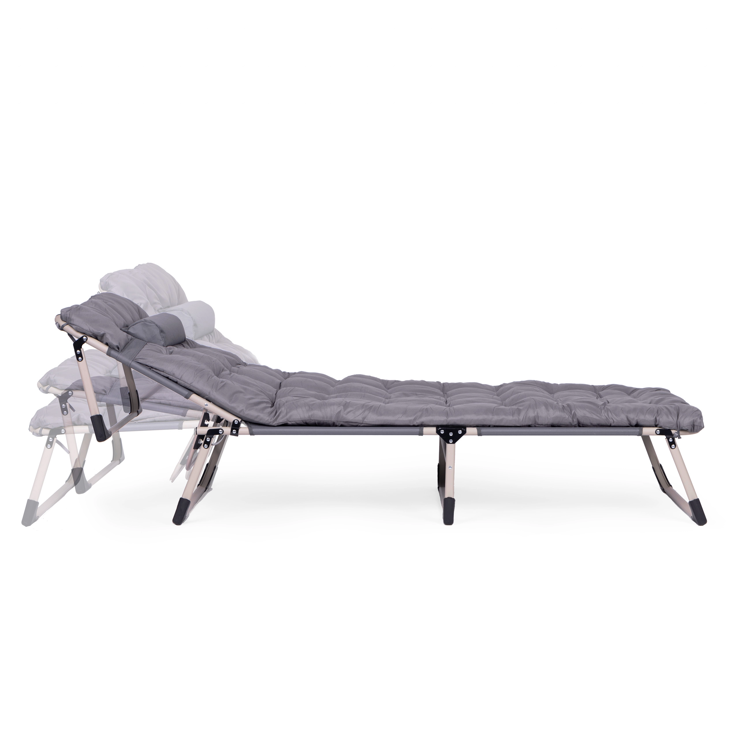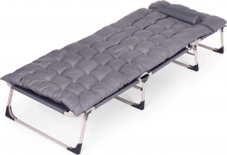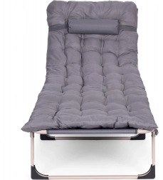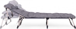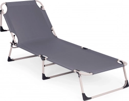 Užijte si relax na zahradě, na rybách i na terase se skládacím lehátkem v univerzální šedé barvě. Nabízí měkkou matraci s polštářem, 4 úrovně polohování opěrky až do lehu, stabilní kovovou konstrukci s protiskluzovými patkami a snadné skládání pro převoz a uskladnění. Maximální nosnost 120 kg.