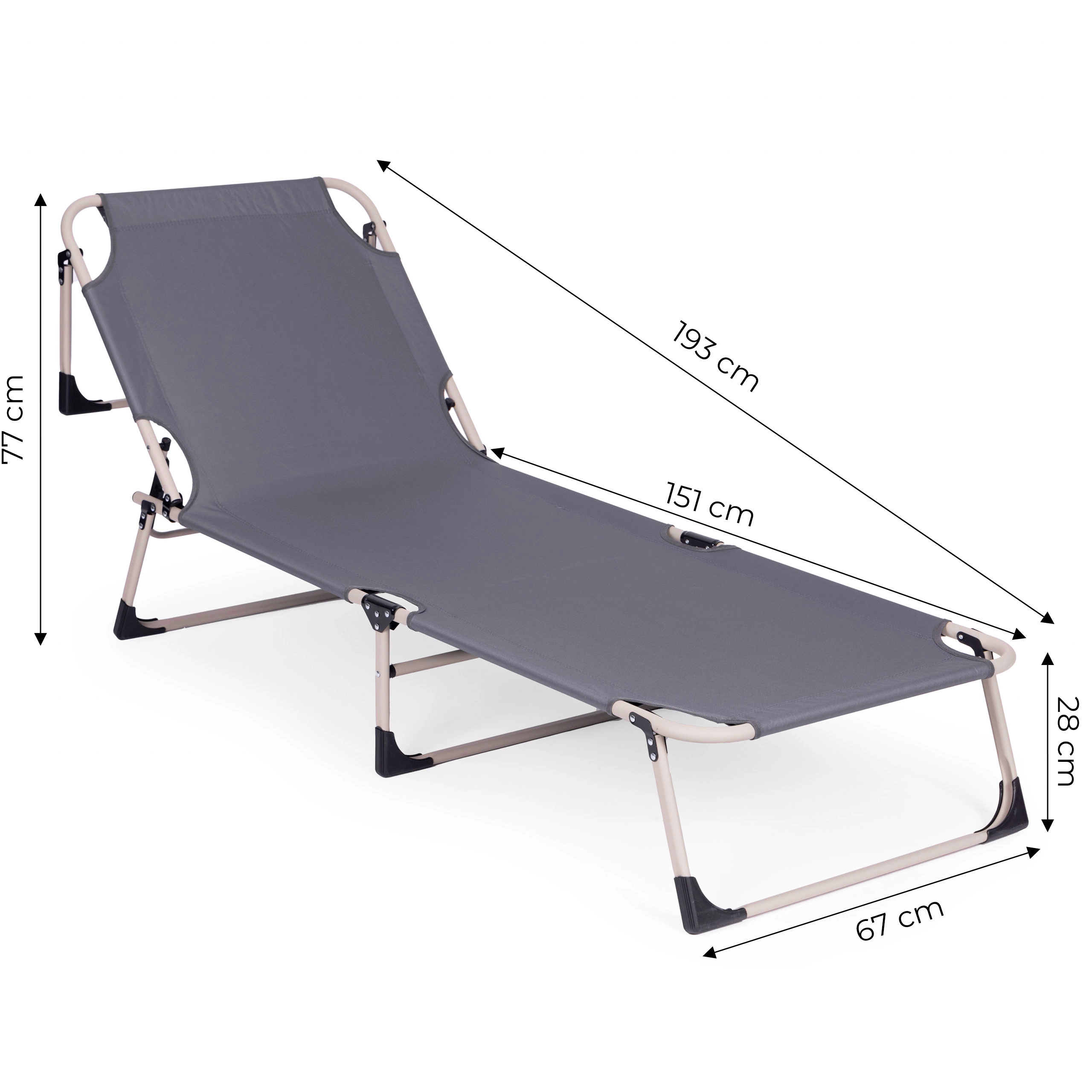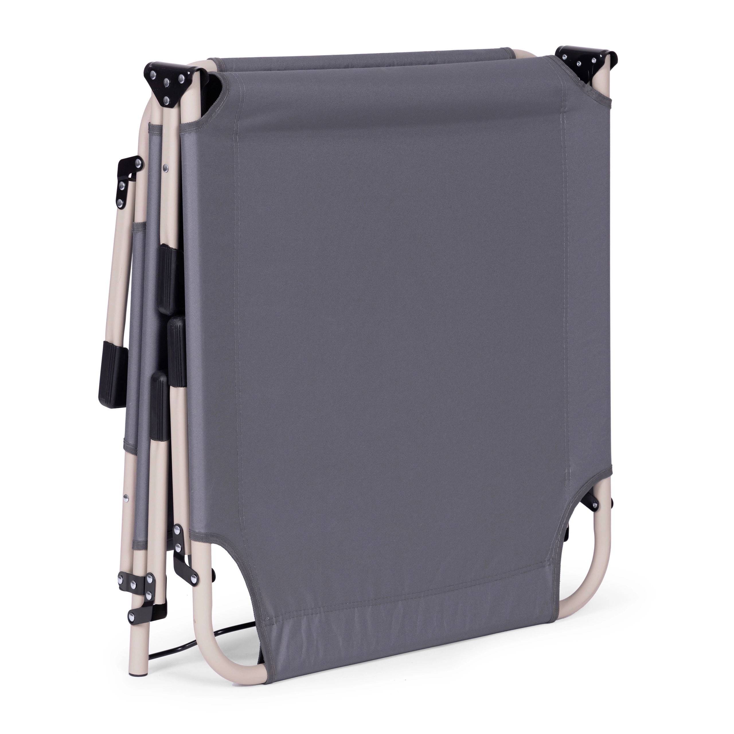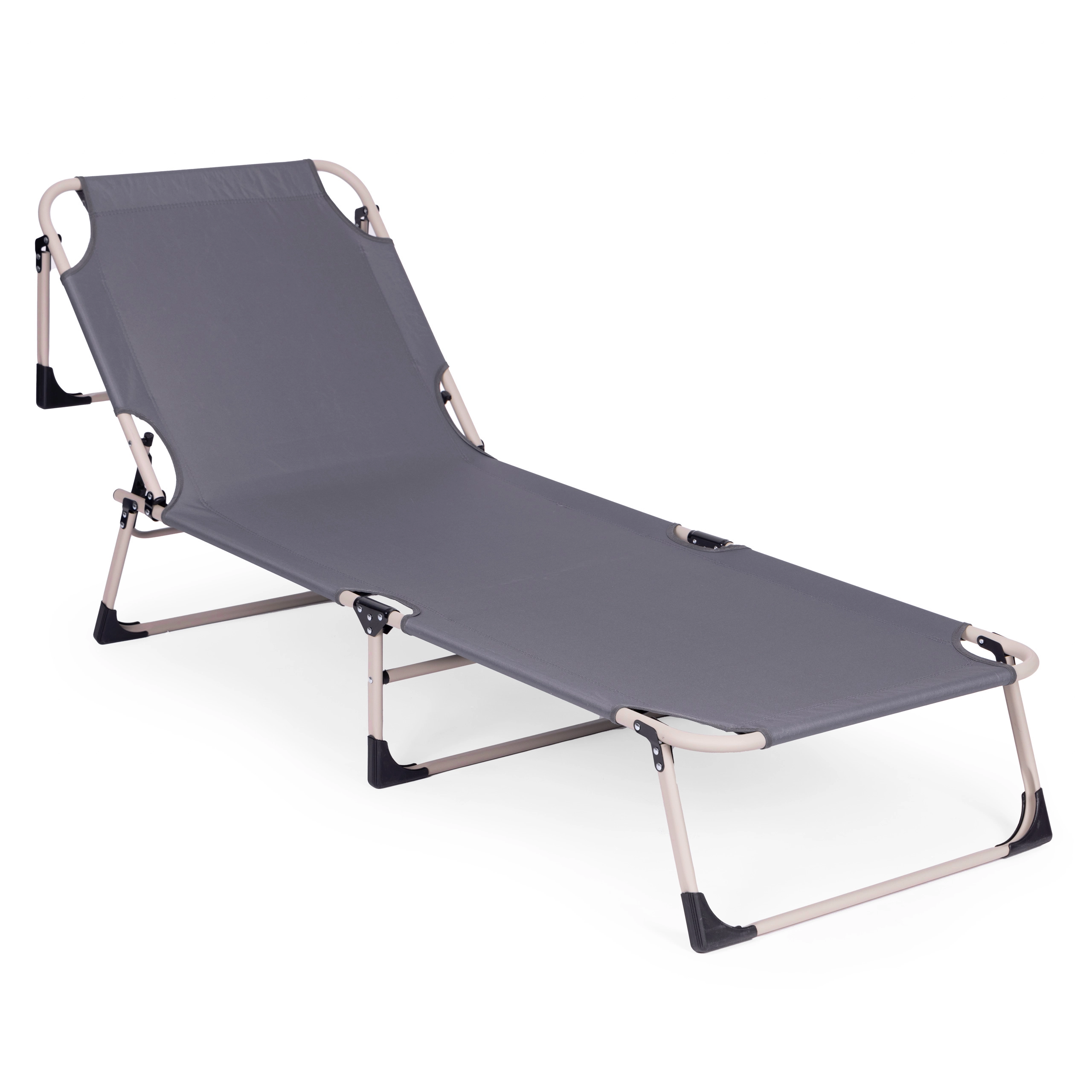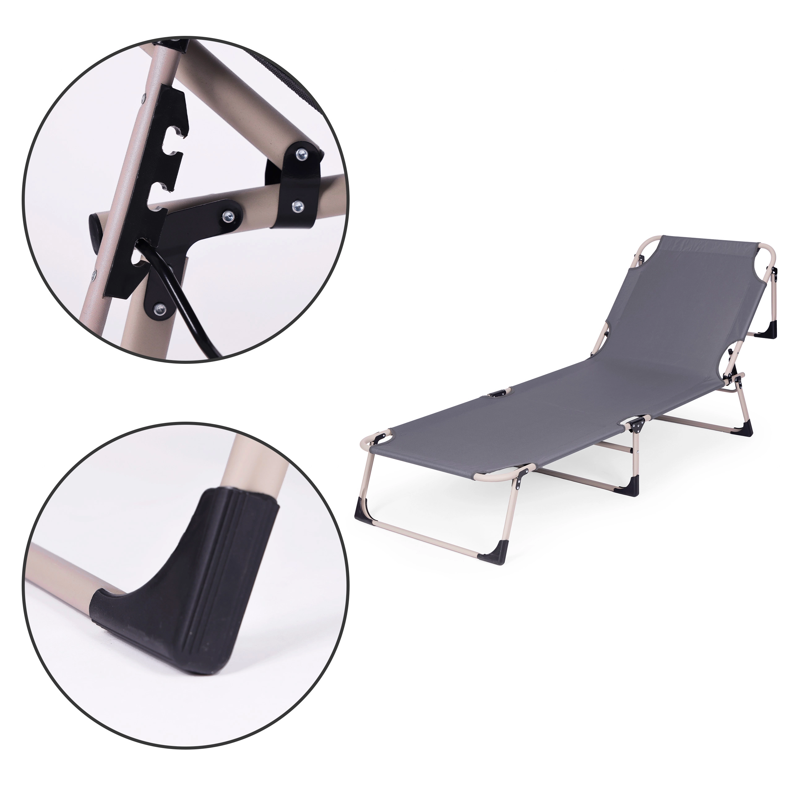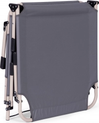 Opěrku zad snadno nastavíte do 4 poloh od polosedu až po plně vodorovnou polohu. Protiskluzové koncovky nohou zvyšují bezpečnost na různých površích. Díky skládací konstrukci lehátko rychle složíte do kompaktních rozměrů a bez námahy přenesete.