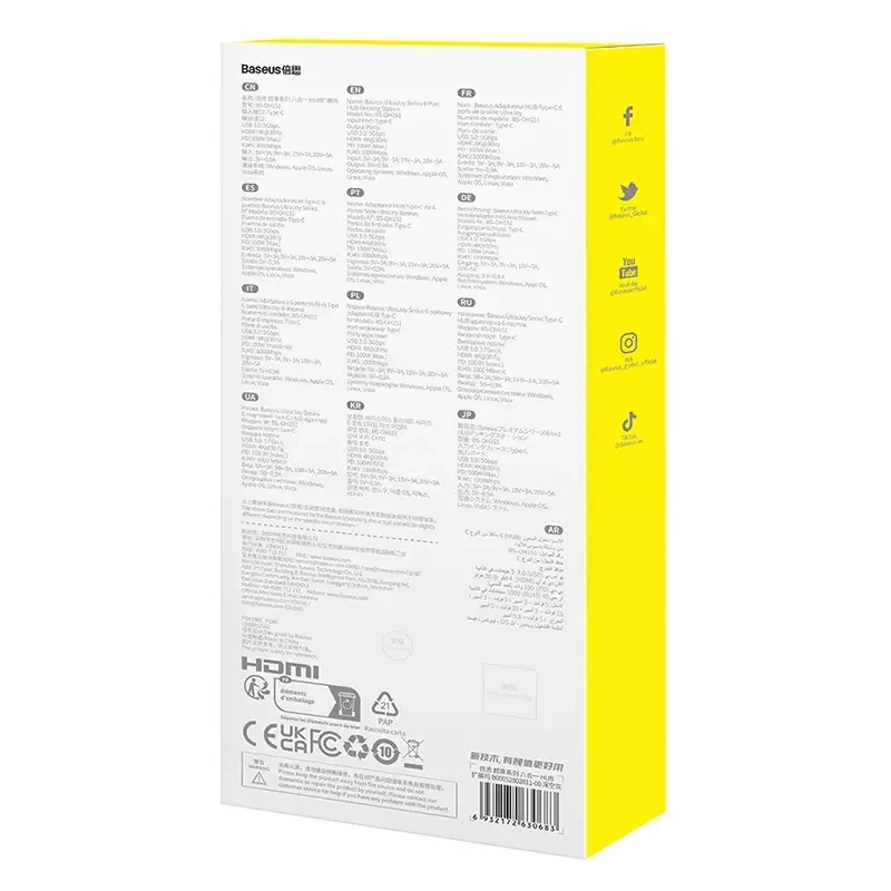 Udělejte z jednoho USB‑C portu centrum konektivity. BASEUS UltraJoy 6v1 přidá tři vysokorychlostní USB 3.0 pro periférie a disky, HDMI s podporou 4K@30 Hz pro ostrý obraz na TV či monitoru, gigabitový Ethernet RJ45 pro stabilní internet a USB‑C Power Delivery 100 W pro průběžné nabíjení notebooku.